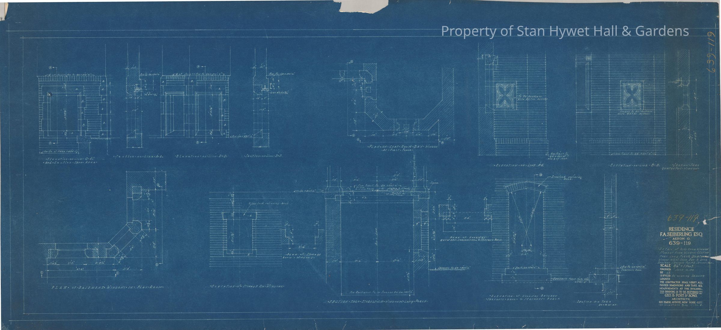 Historic blueprint: Detailed drawings of windows on the first floor and basement level, specifically the windows in the back of the workroom (Play Room) and windows in the Powder Room. There are also drawings of doorways, and sections of the North Porch (Long Porch). Titled "Detail of Play Room Window Storage Room Window, Section [Thro] Long Porch, Quatrefoil window in Coat Room, Bay & Door Between Servants Porch & Servants Hall".
