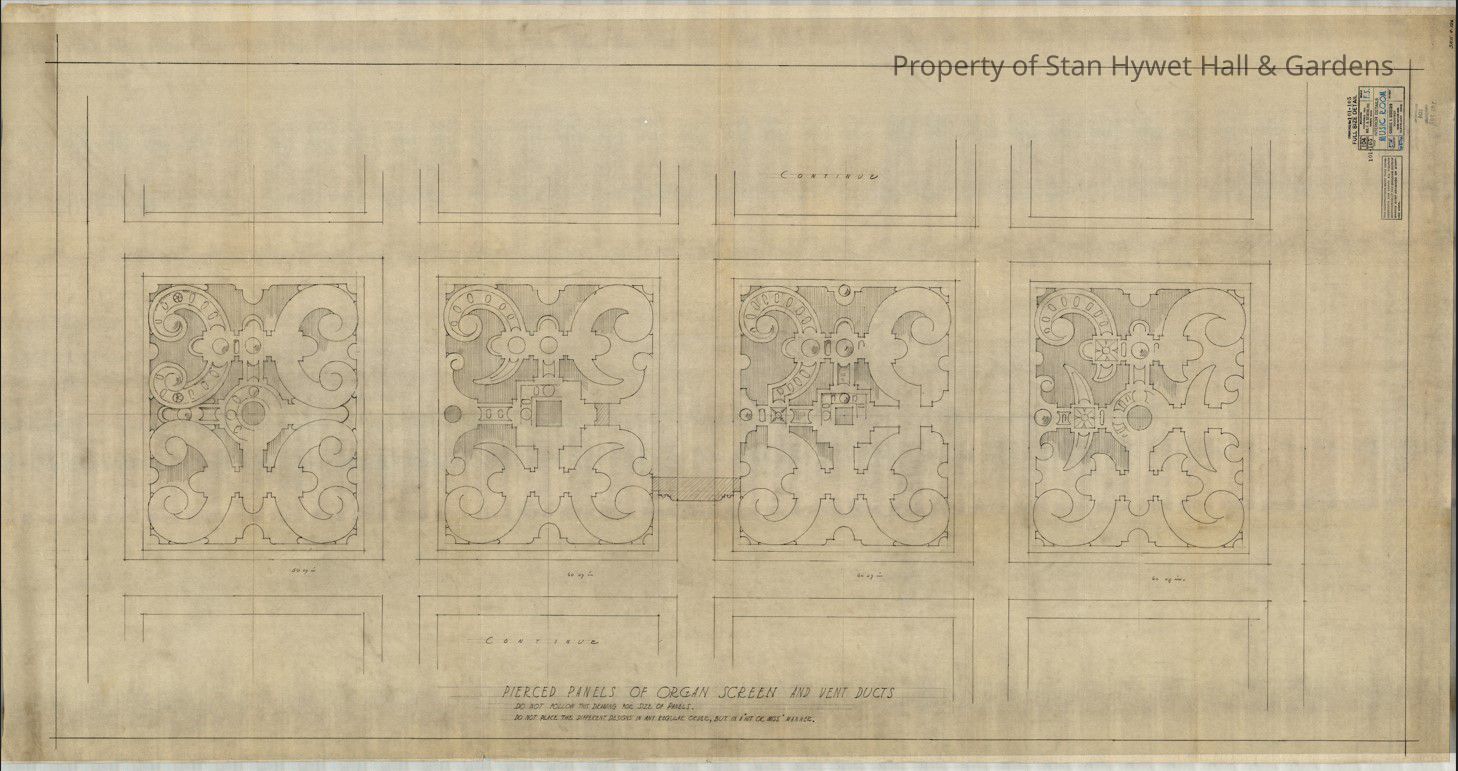 Historic drawing: Full sized details of wall woodwork in the Music Room. Titled "Interior Details Music Room: Pierced Panels of Organ Screen and Vent Ducts".