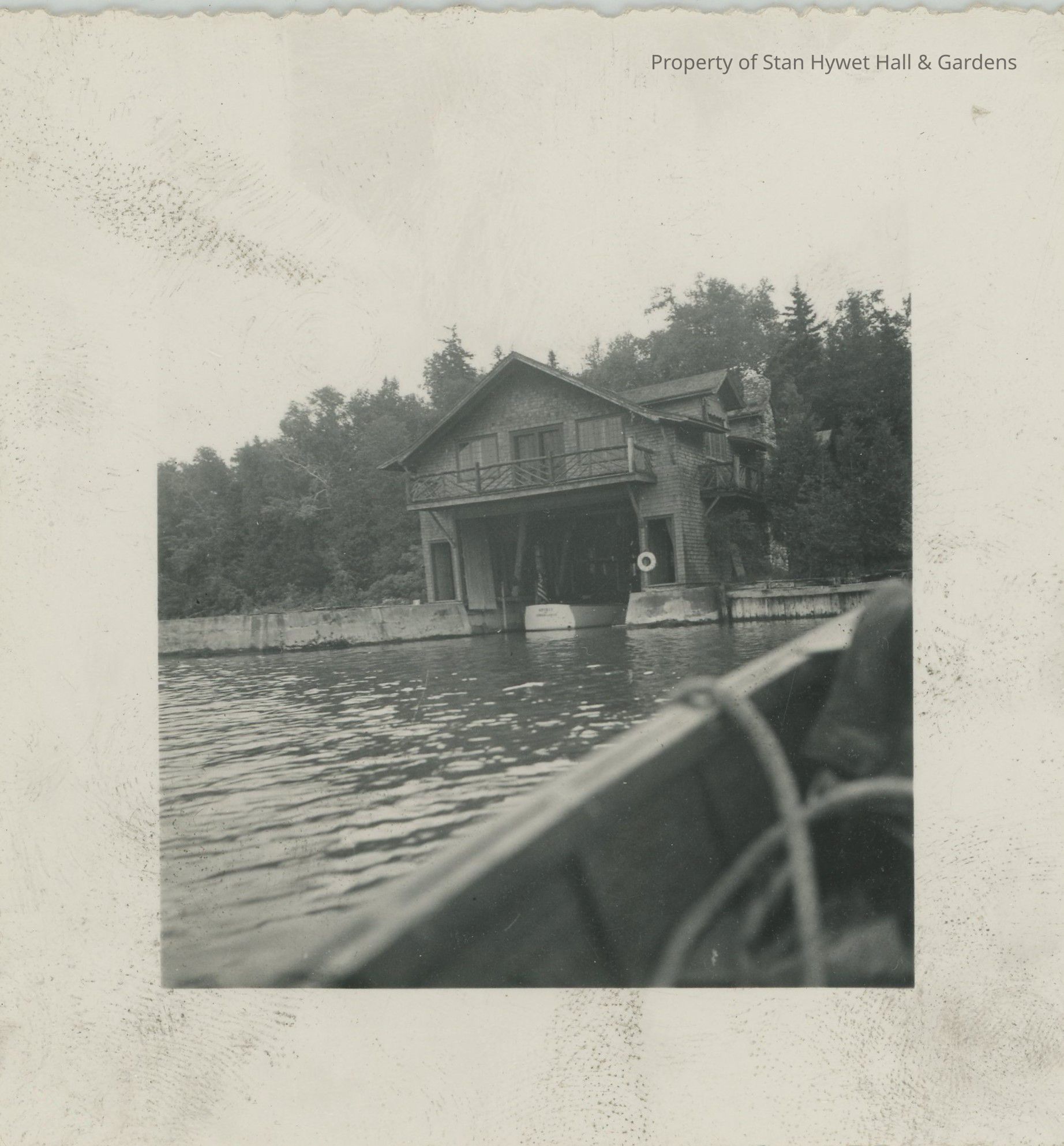 Black and white photographic print of the boat house at Cedar Lodge. The bow of a boat is in the lower right corner implying that the photographer was on the boat. A rope is looped and over the side. There is a boat in the slip of the boathouse. A life-preserver is hanging on right support. Two windows and double doors on second floor balcony overlooking the lake.Photograph Details