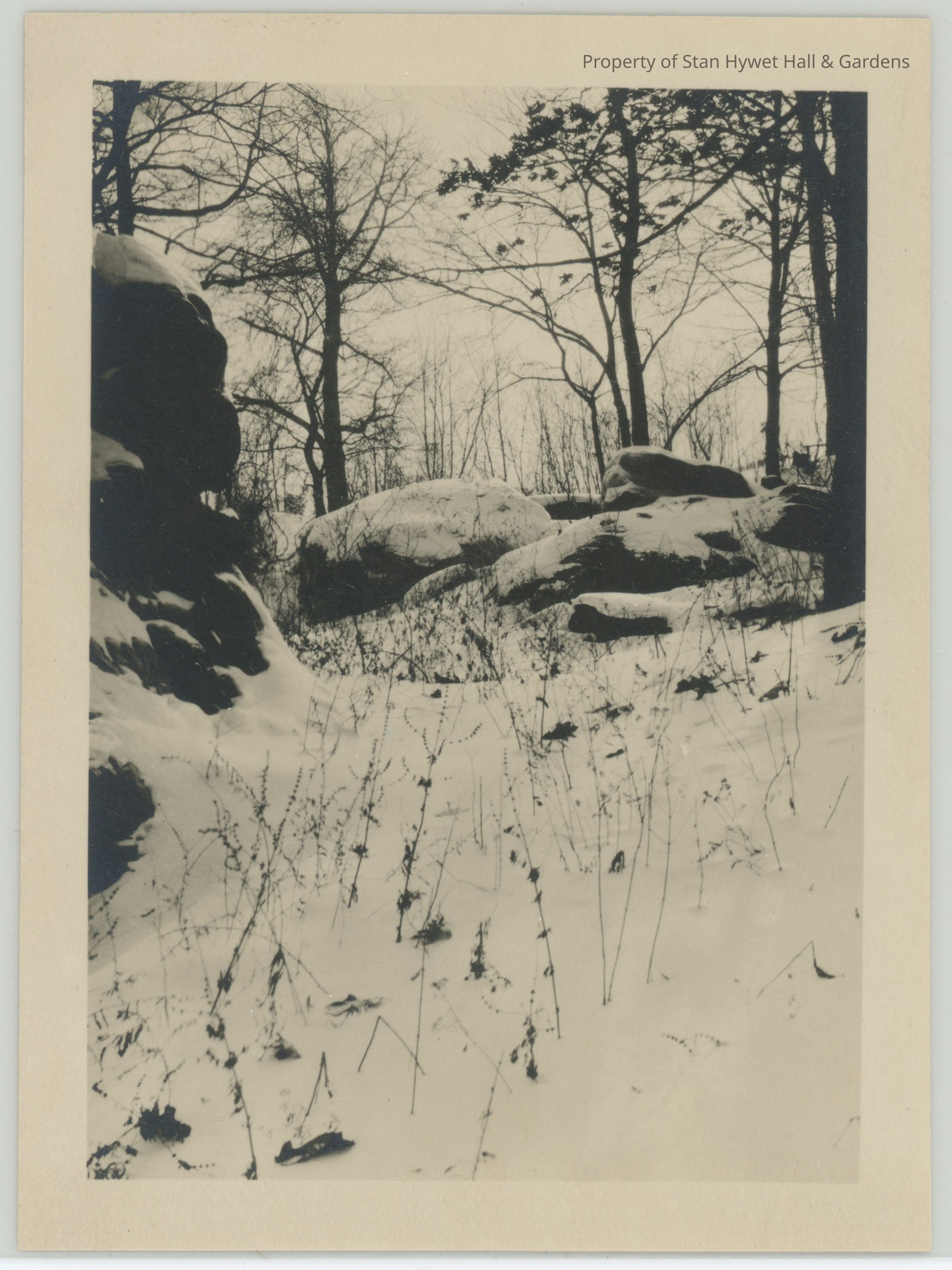 Black and white photograph of snow-covered landscape with tall weeds in the bottom half of the photo, large boulders in the center with large trees on the crest. Large rock outcropping on the left side of photo. Most trees are bare but there are some leaves in the top right corner. (Possibly Stan Hywet grounds pre-construction.)Photograph Details