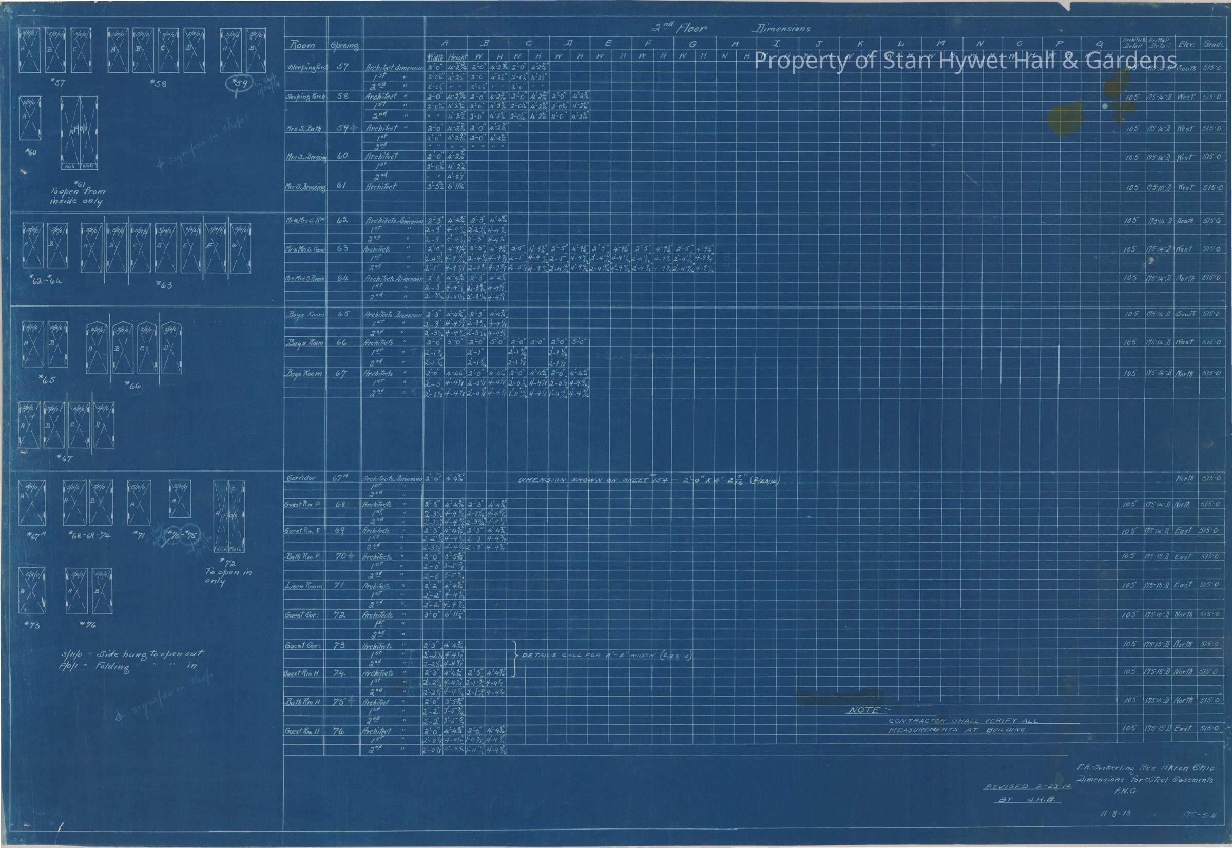 Historic Blueprint: Table detailing dimensions of steel casements for second floor windows #57-76. Titled "Dimensions of Steel Casements".