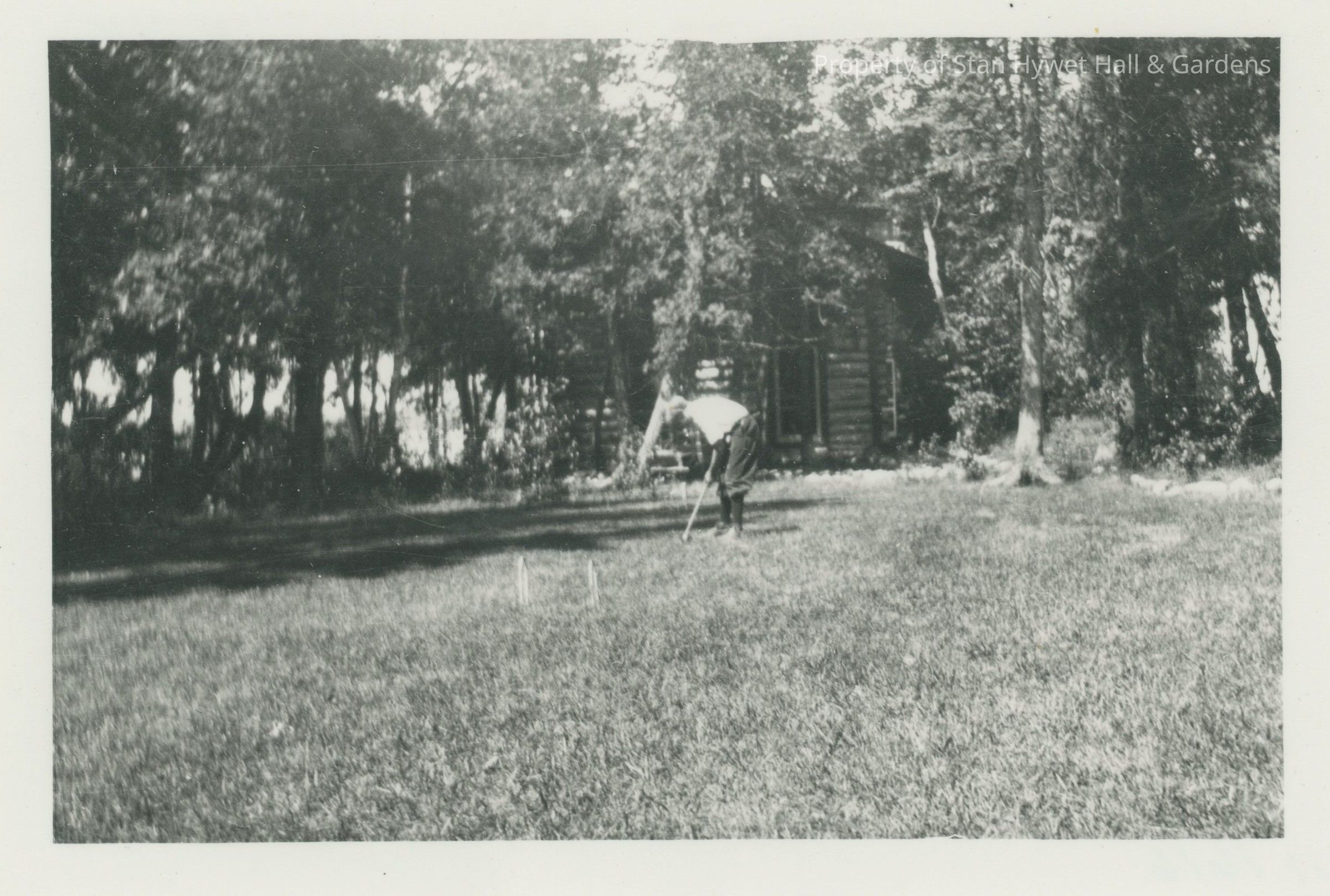 Black and white photographic print of a young boy playing croquet. Boy in middle ground bending over; mallet aiming for two wickets seen in the middle ground. Trees and Shore Cabin of Cedar Lodge is in the background.Photograph Details