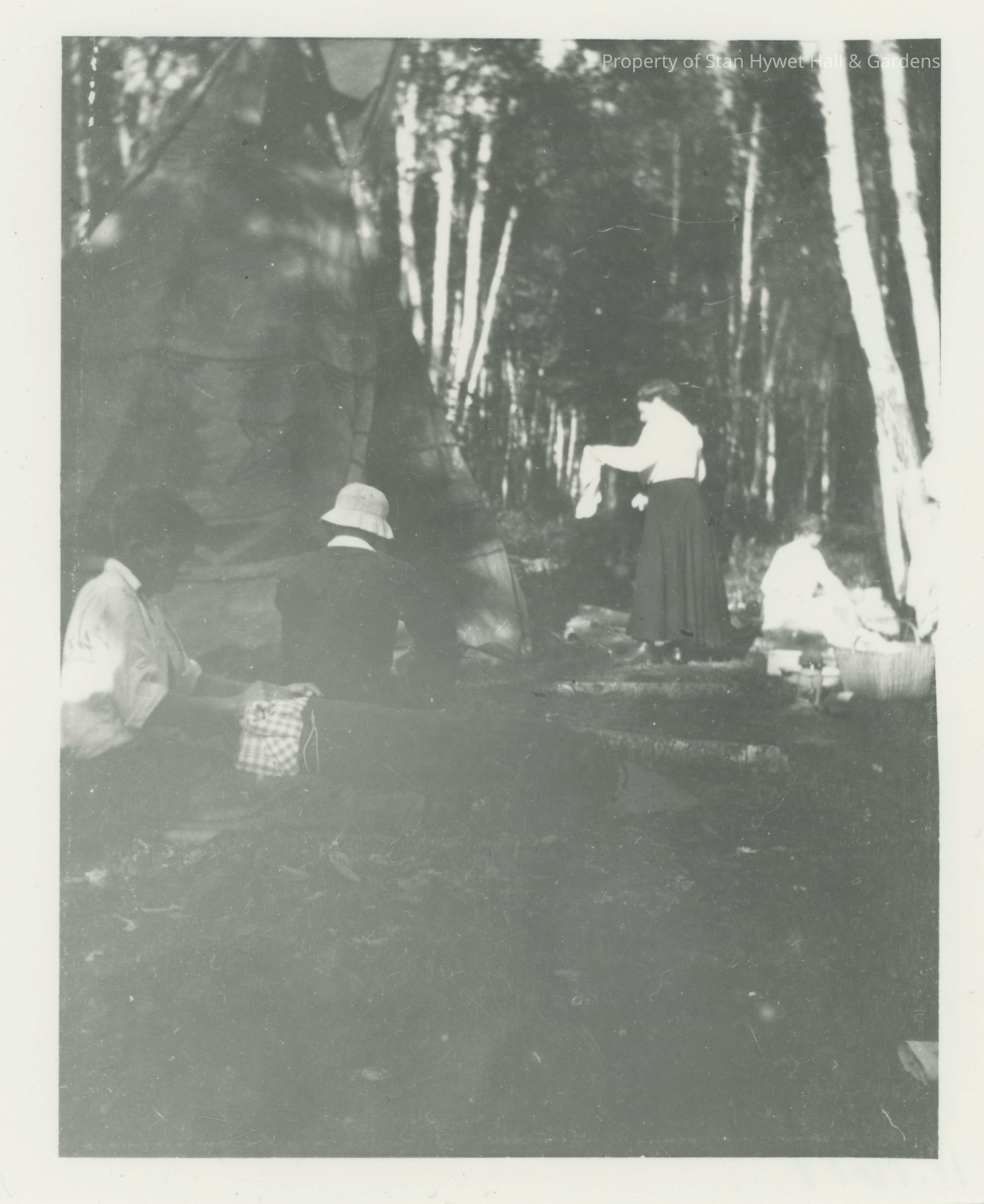 Black and white reproduction photographic print. Four people at a teepee in Hessel, likely Camp Wildwood. Young man at left in profile, shirt sleeves rolled up working with checked material of some kind. Second from left man with back to camera, dark sweater, light canvas hat. Third from left on other side of teepee. Lady in dark long skirt, white blouse with something light in left hand. Small person or child sitting at right near large basket.Photograph Details