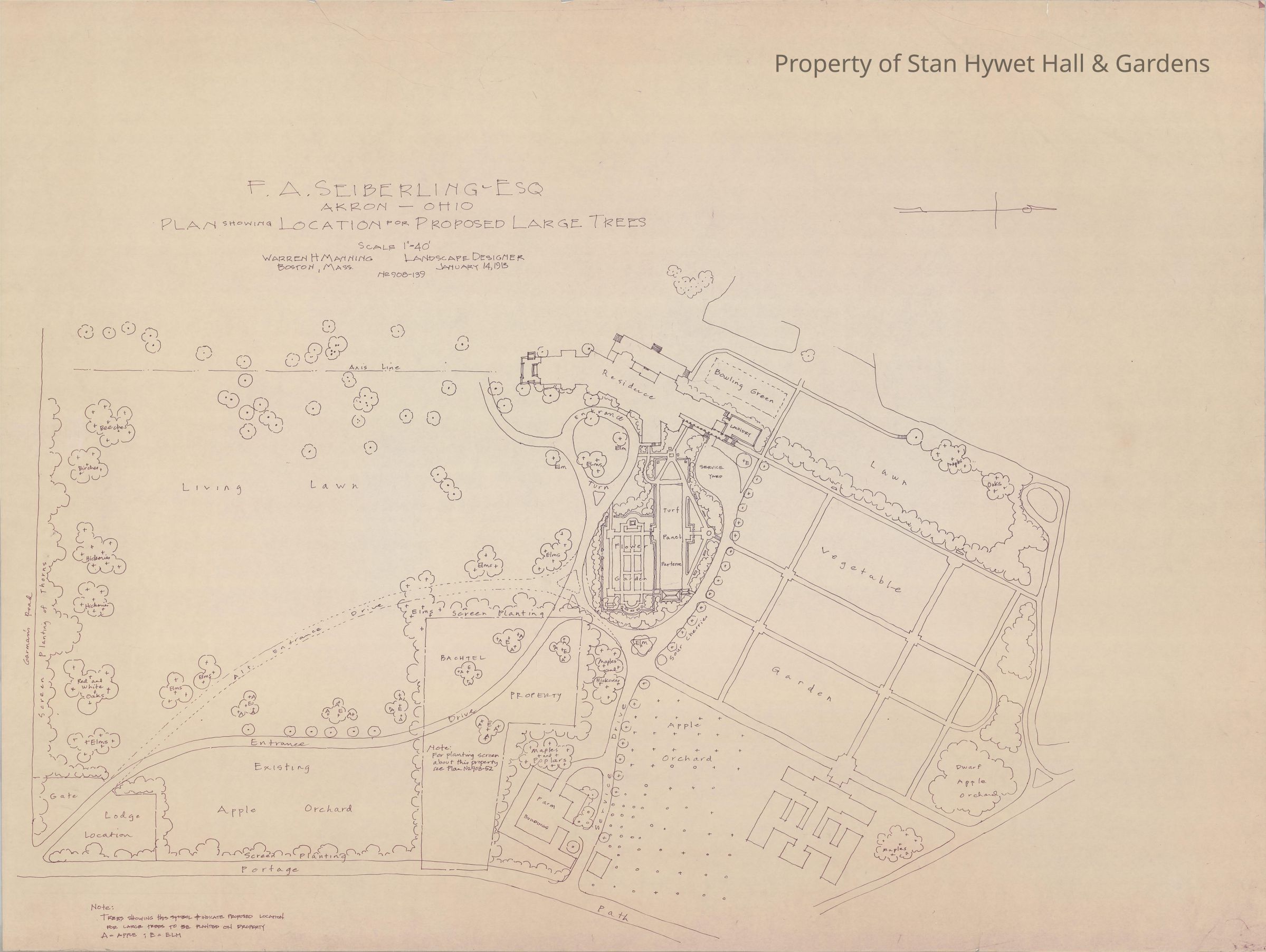 Historic drawing: Concept plan of the grounds and gardens of Stan Hywet Hall estate, includes apple orchard, vegetable garden, flower gardens, etc. Titled "Plan Showing Location for Proposed Large Trees."
