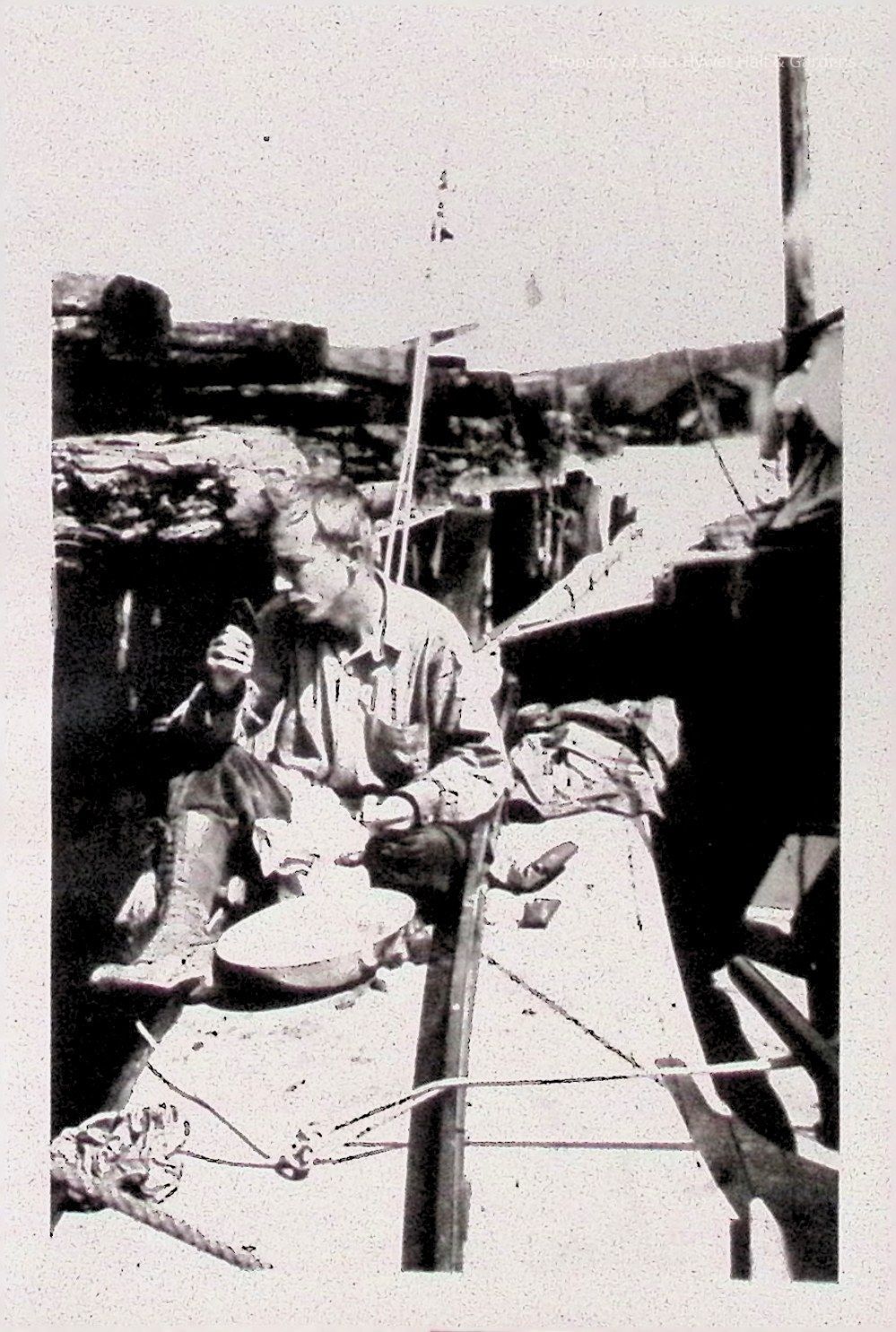 Black and white photographic print of Fred Seiberling sitting on deck of sail boat that is moored to a rough deck. Fred is shaving, holding small kit mirror in right hand, towel in lap, left leg bent under right leg. Wash basin in front of left leg. Lake area in background with building and cliffs in back.Photograph Details