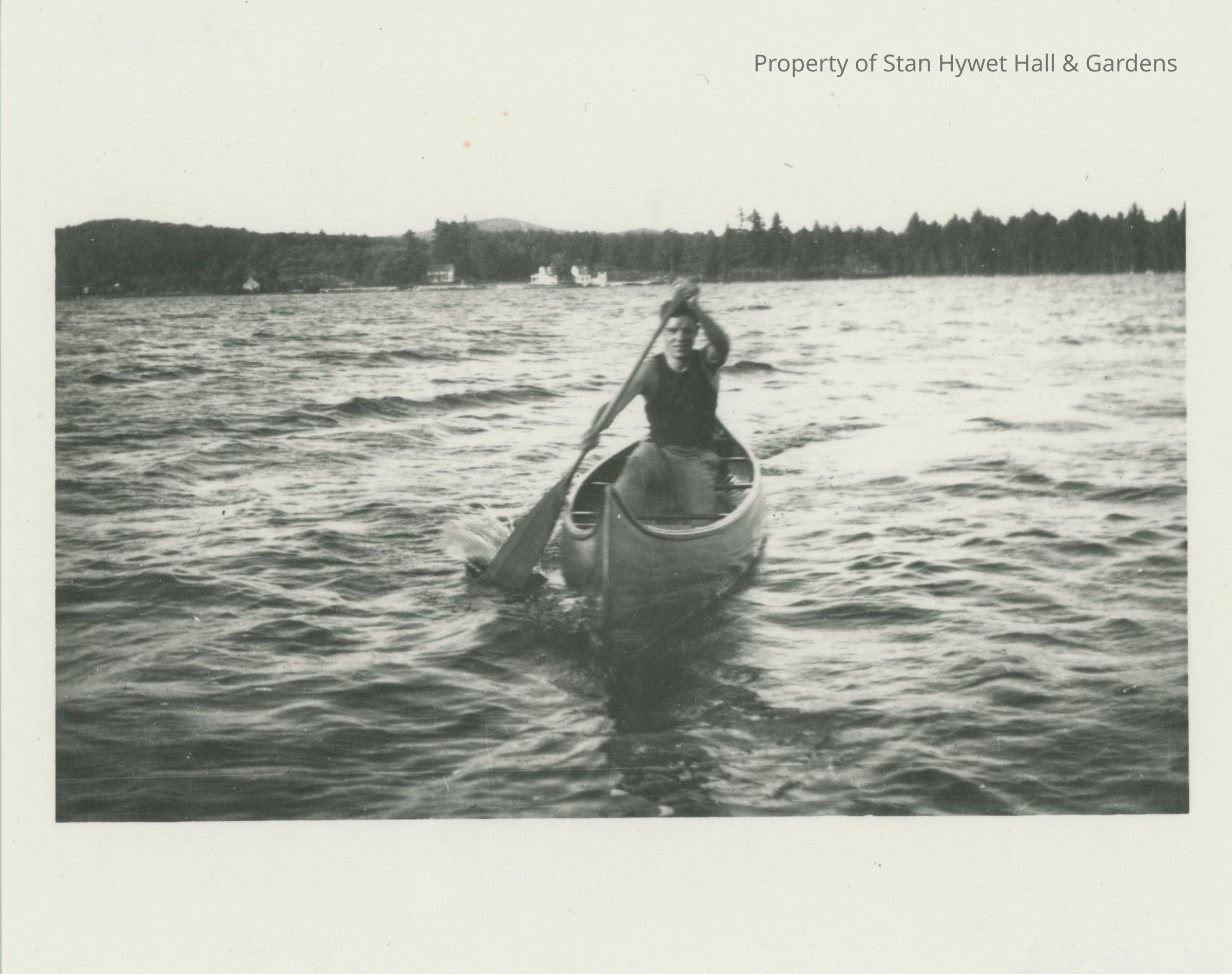 Black and white photographic print. Young man canoeing almost straight toward camera. Splash from paddle caught by camera. He is sitting on middle brace between gunnels which is both improper and dangerous. Light slacks, dark tank top. In background, shore of lake with trees, homes and buildings layer hill way back.Photograph Details