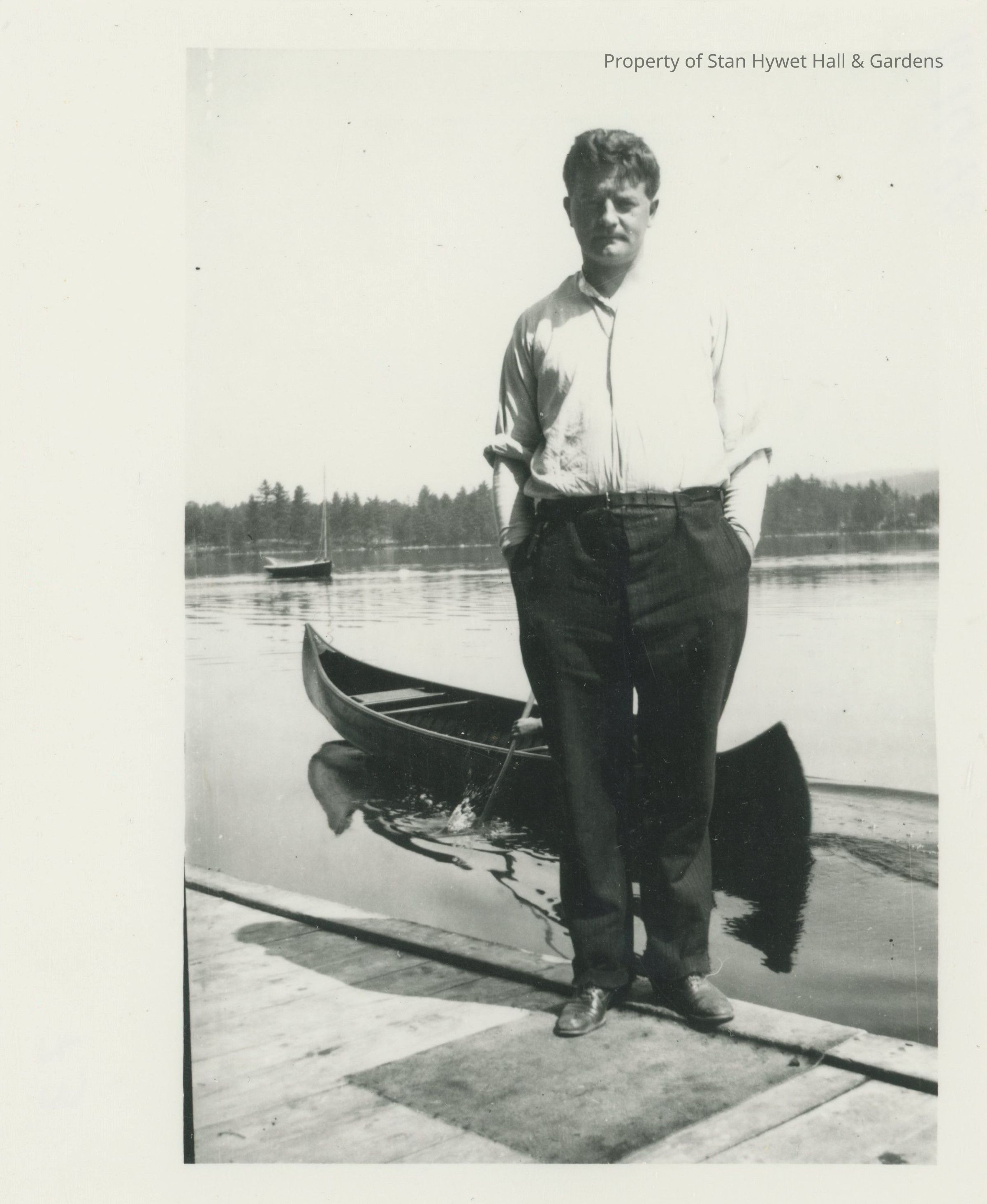 Black and white photographic print. Man standing on the edge of a dock in Hessel, hands in pockets. Long sleeved shirt under rolled up button down shirt sleeves. Person in moving canoe directly behind man with only one hand visible on paddle. Sailboat anchored in left background. Shore and lights across photo in background. Wide left border.Photograph Details