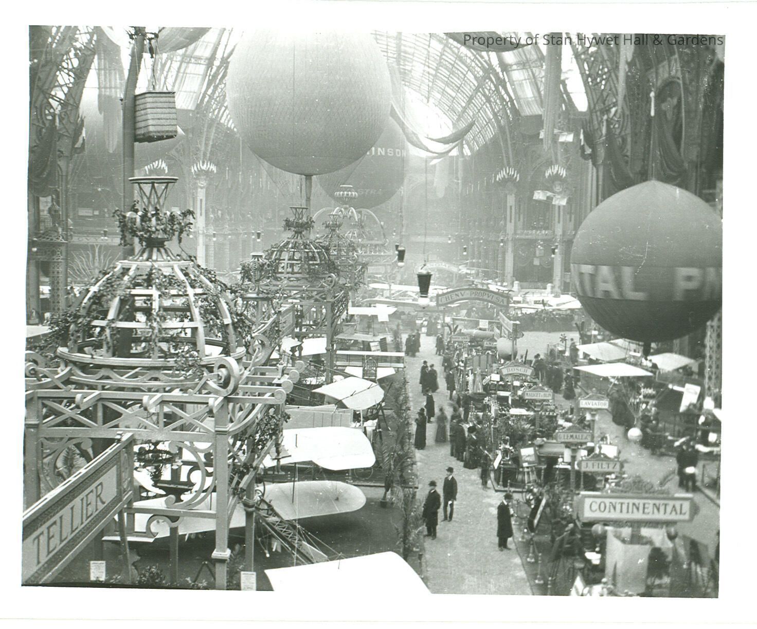 Black and white photographic print taken at the Paris Air Show in 1909. Interior view of exhibition hall with many display booths visible, along with three large hot air balloons and many planes. Men and women walking up and down aisles. Large glass windows in roof with banners and light fixtures hanging downCollection
