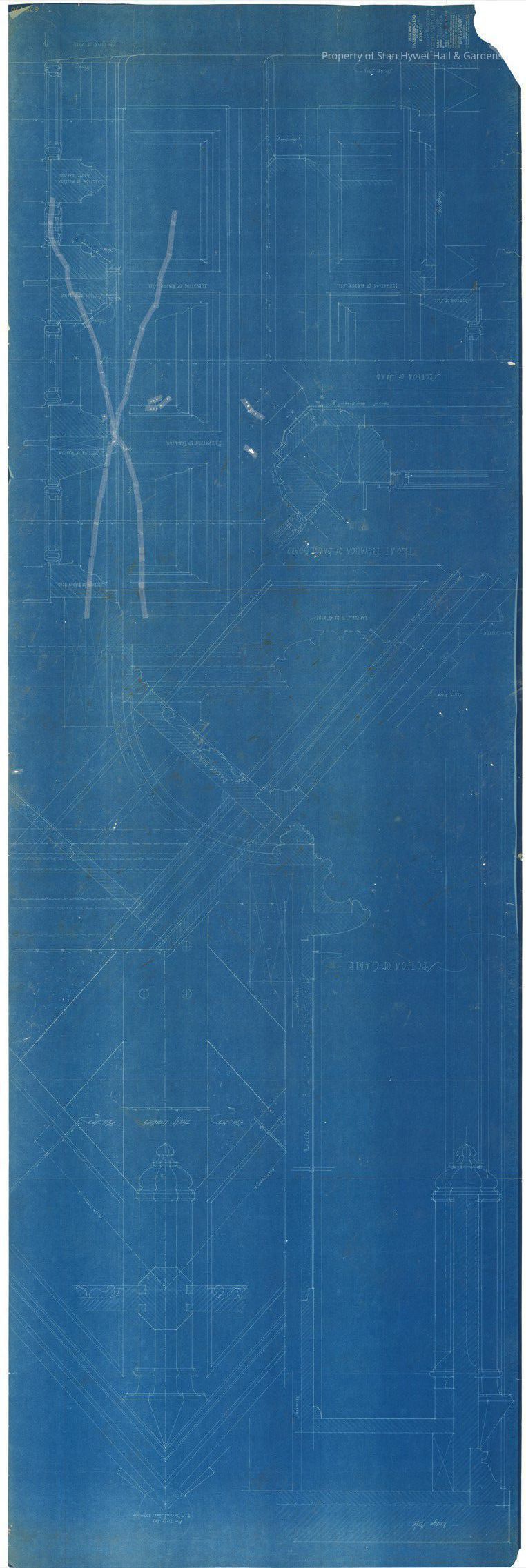Historic Blueprint: Full sized detailed drawings of the entrance and gable in the Music Room. Titled "Details of Music Room Entrance and Gable".