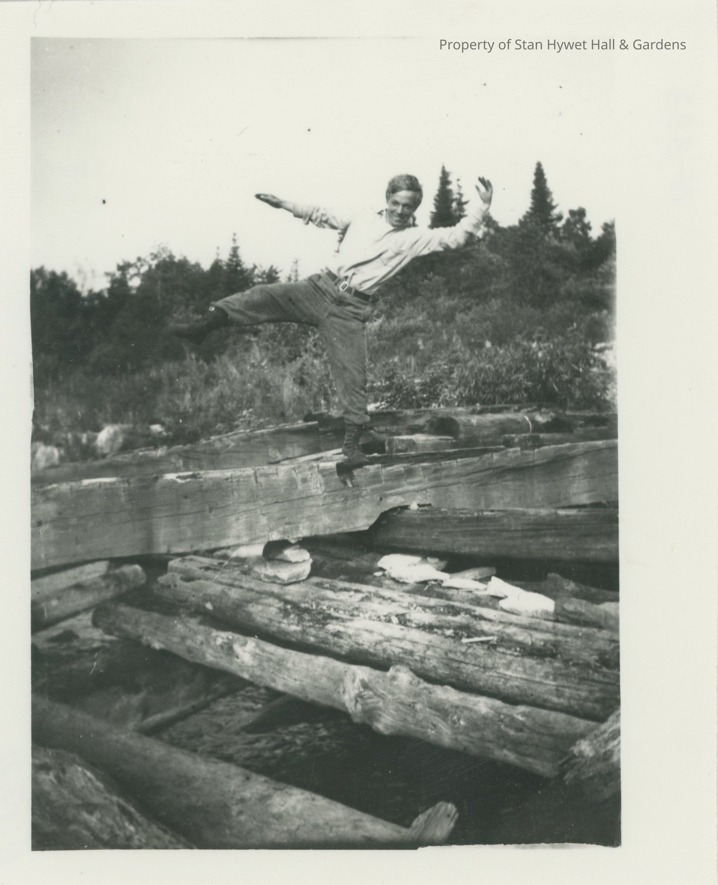 Black and white photographic print of Fred Seiberling balancing on a wooden beam, teetering almost to the point of falling. He is standing on his left foot with his right leg at 90 degrees and both arms out to the side to help balance. He has a large smile on his face. The beam is stacked across large logs and propped up with stones. Woods in background. Larger border on right side.Photograph Details