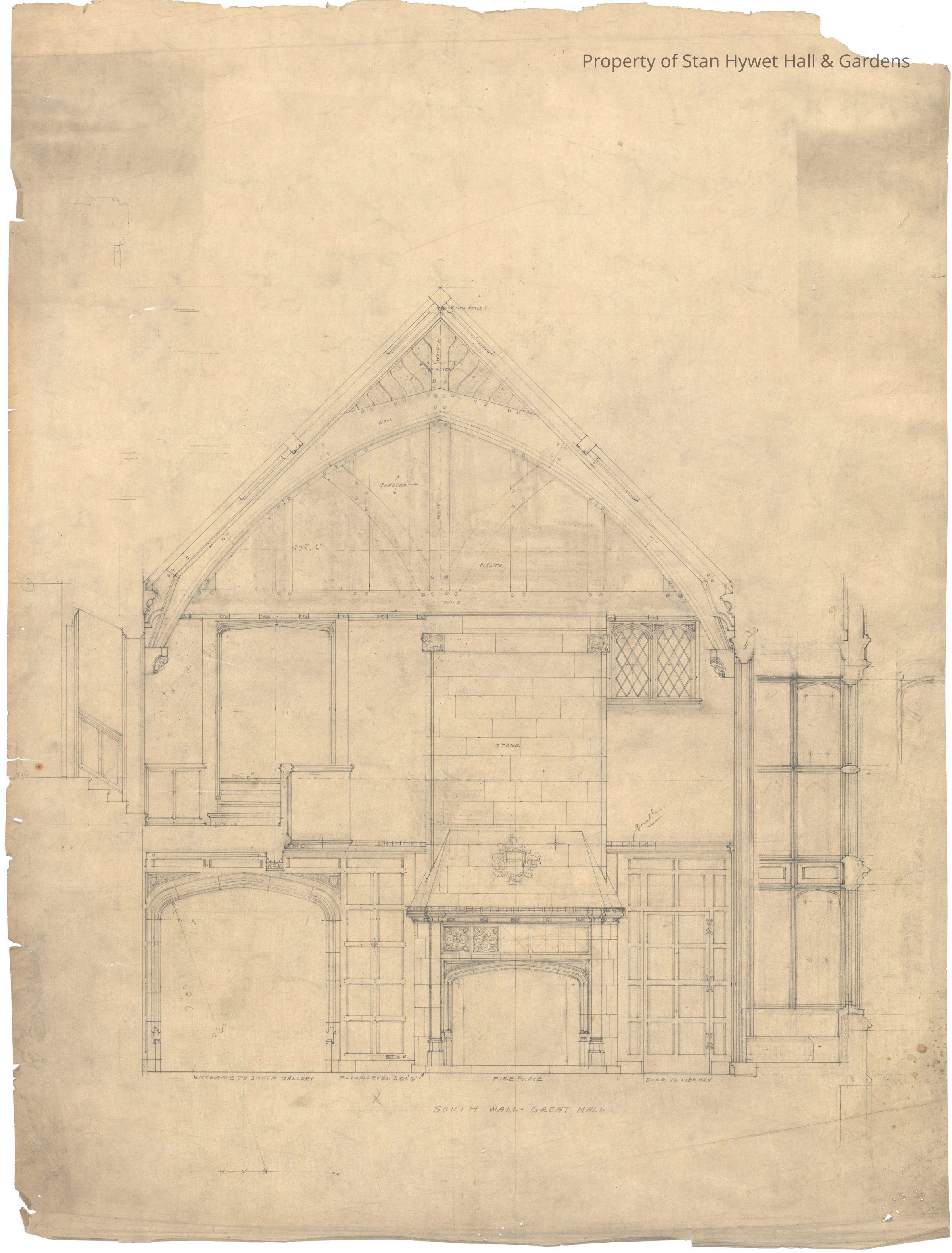 Historic drawing: Detailed drawing of the Great Hall south wall. The crest over the fireplace was a concept that was not included in the final build. Titled "South Wall Great Hall".Collection