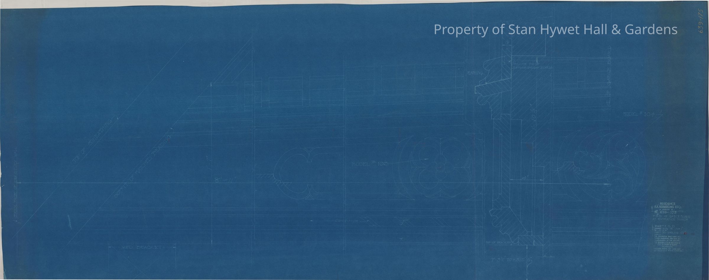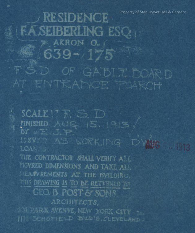 Historic Blueprint: Full sized detailed drawing of the gable board over the Entrance Porch of Stan Hywet Hall. Titled "F.S.D. of Gable Board at Entrance Poarch".