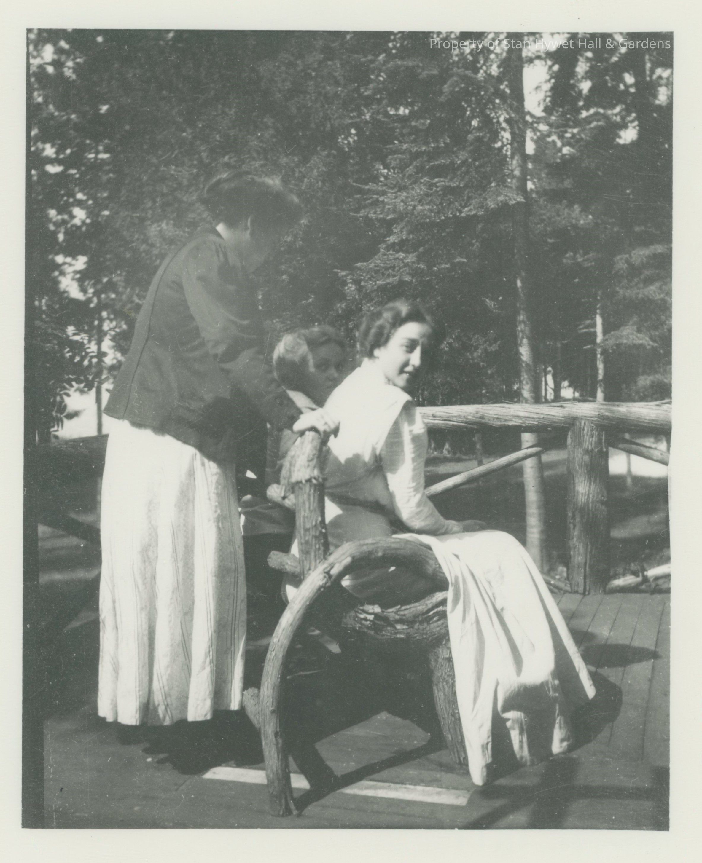 Black and white photographic print of Irene Seiberling Harrison and a young woman sitting on bent wood settee with another woman standing behind, leaning on back of settee. The woman standing is wearing a dark jacket with a light skirt and is looking toward Irene. Irene is hidden except for her head and she is looking at the camera. The other woman is blocking her and she is also looking at the camera. She is wearing a light colored dress. They are on the porch of the Main Cabin at Cedar Lodge.Photograph Details