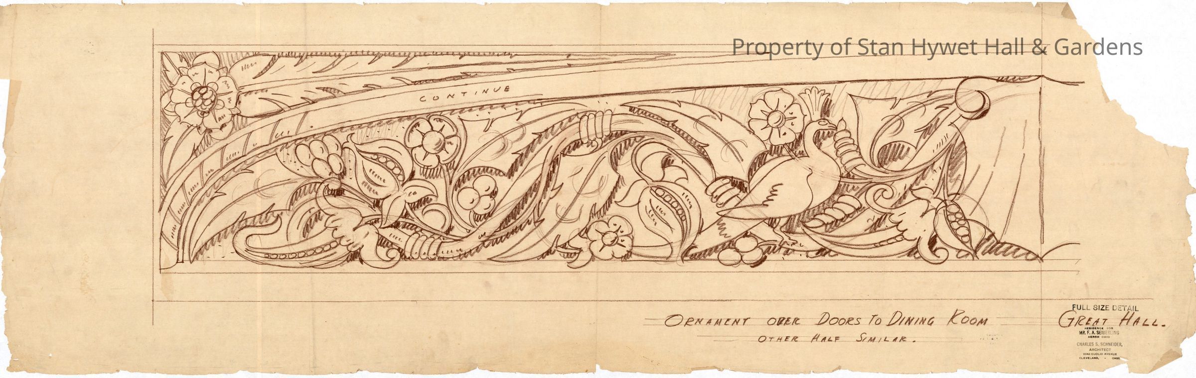Historic Drawing: Detailed drawing of woodwork carving design over Great Hall door to Dining Room in Stan Hywet Hall. Titled "Ornament Over Doors to Dining Room".