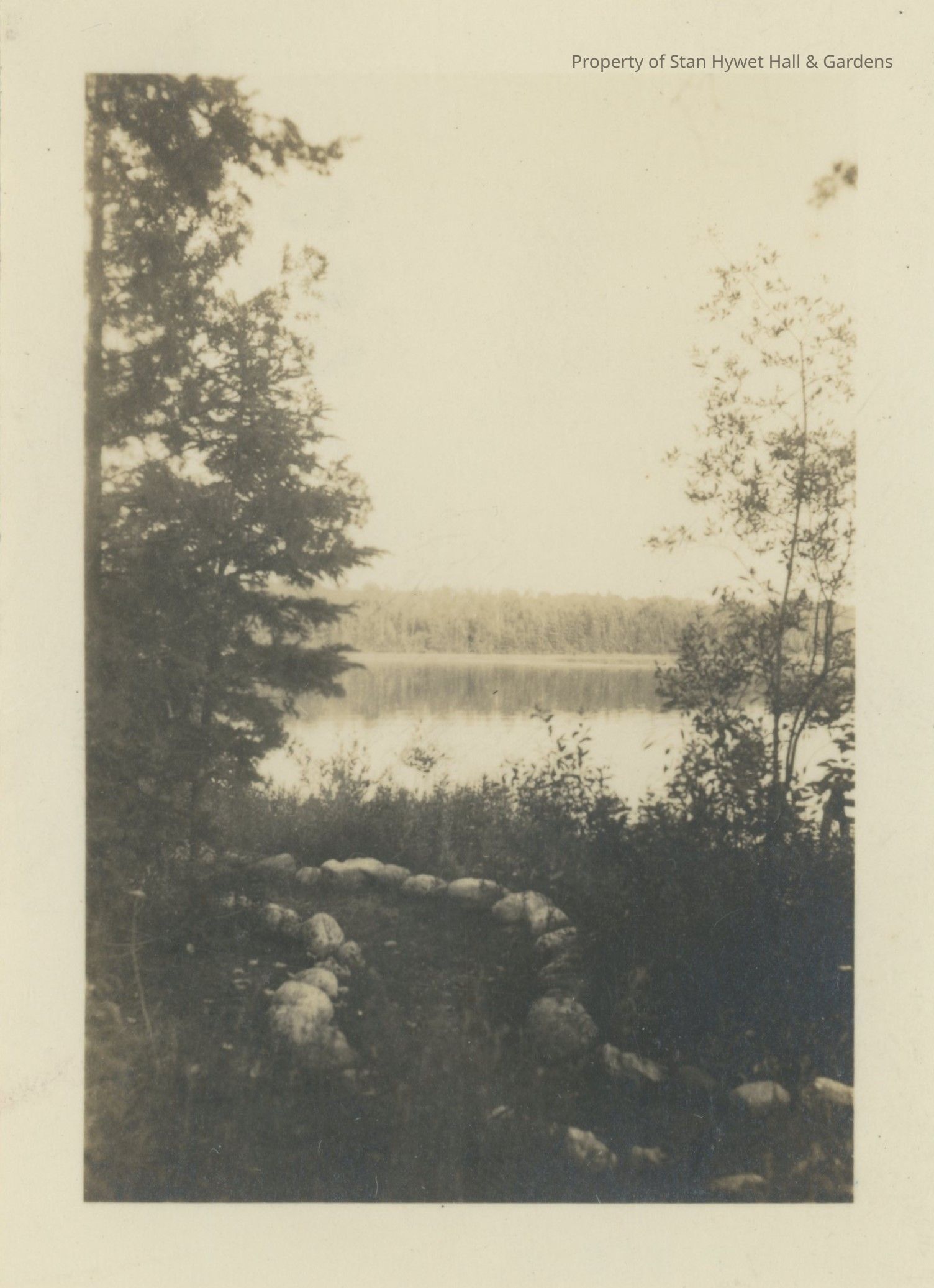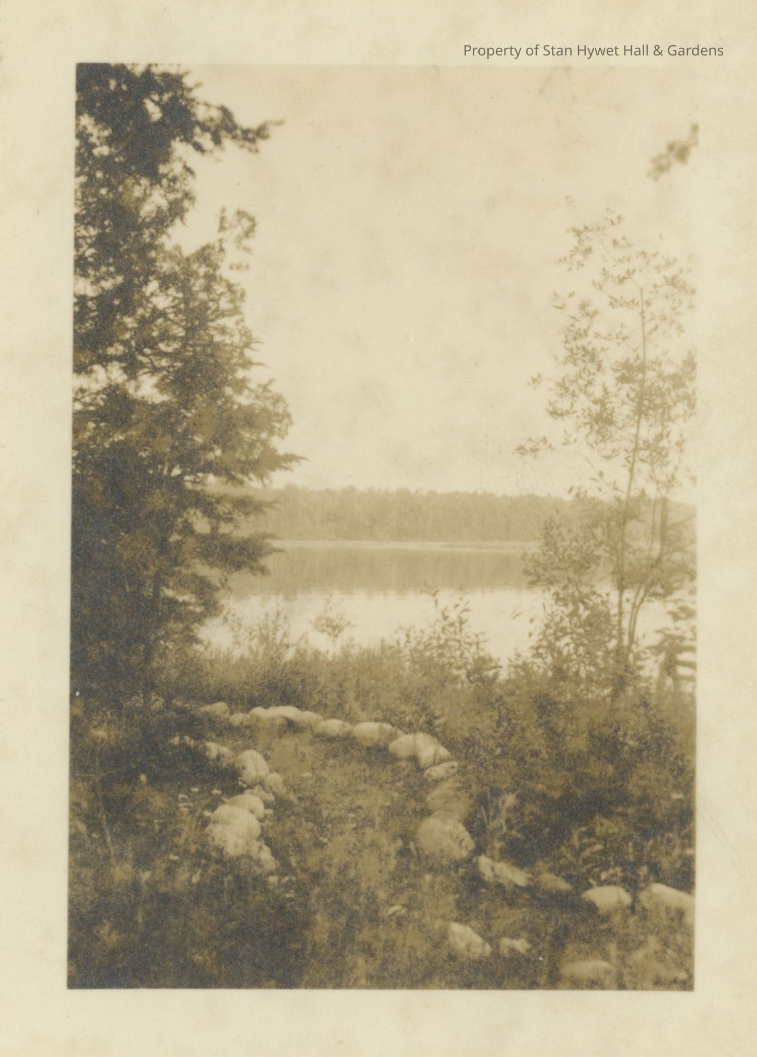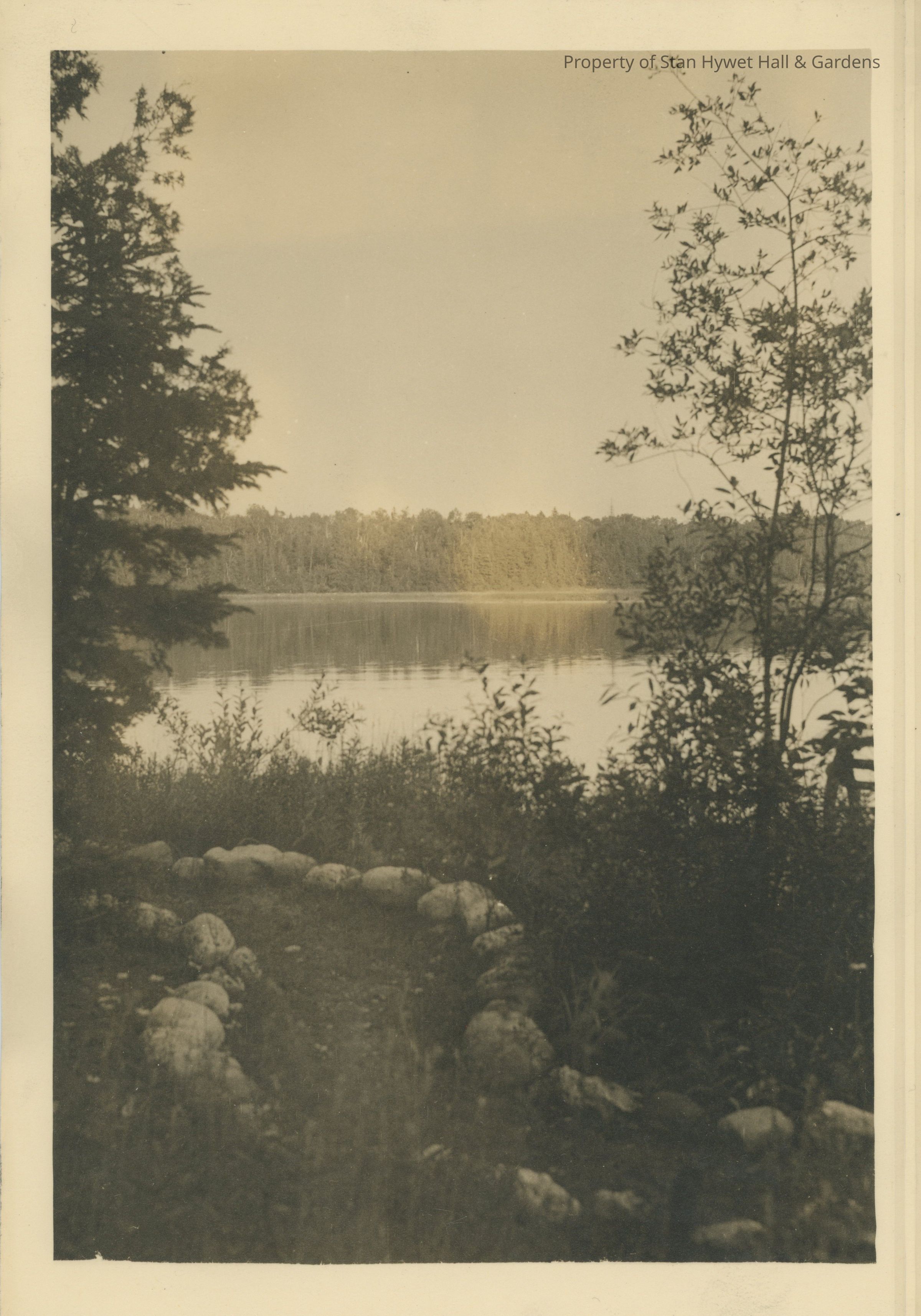 Black and white photographic print from a series of the area around Cedar Lodge. A bending path lined with stones in the foreground with the lake beyond and trees along the shoreline on other side. Small trees at each side of photo. A light spot is in the center of the far shore either due to light seepage or a drop of developing fluid.Photograph Details