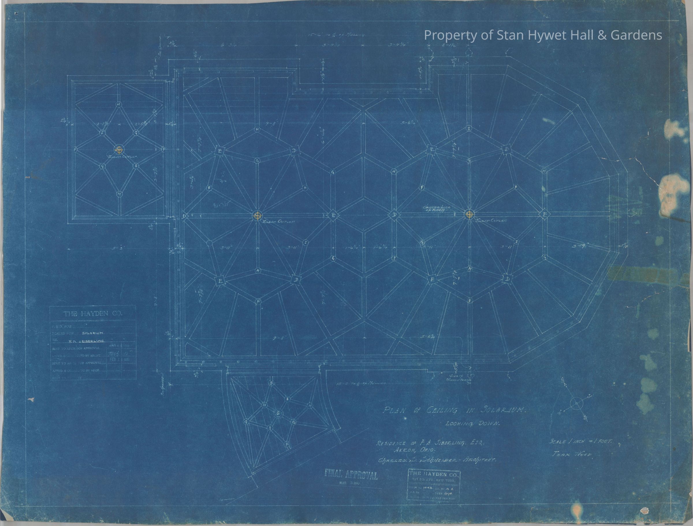 Historic blueprint: Plan of ceiling in Solarium of Stan Hywet Hall. Blueprint mentions the wood in ceiling is teak wood.
