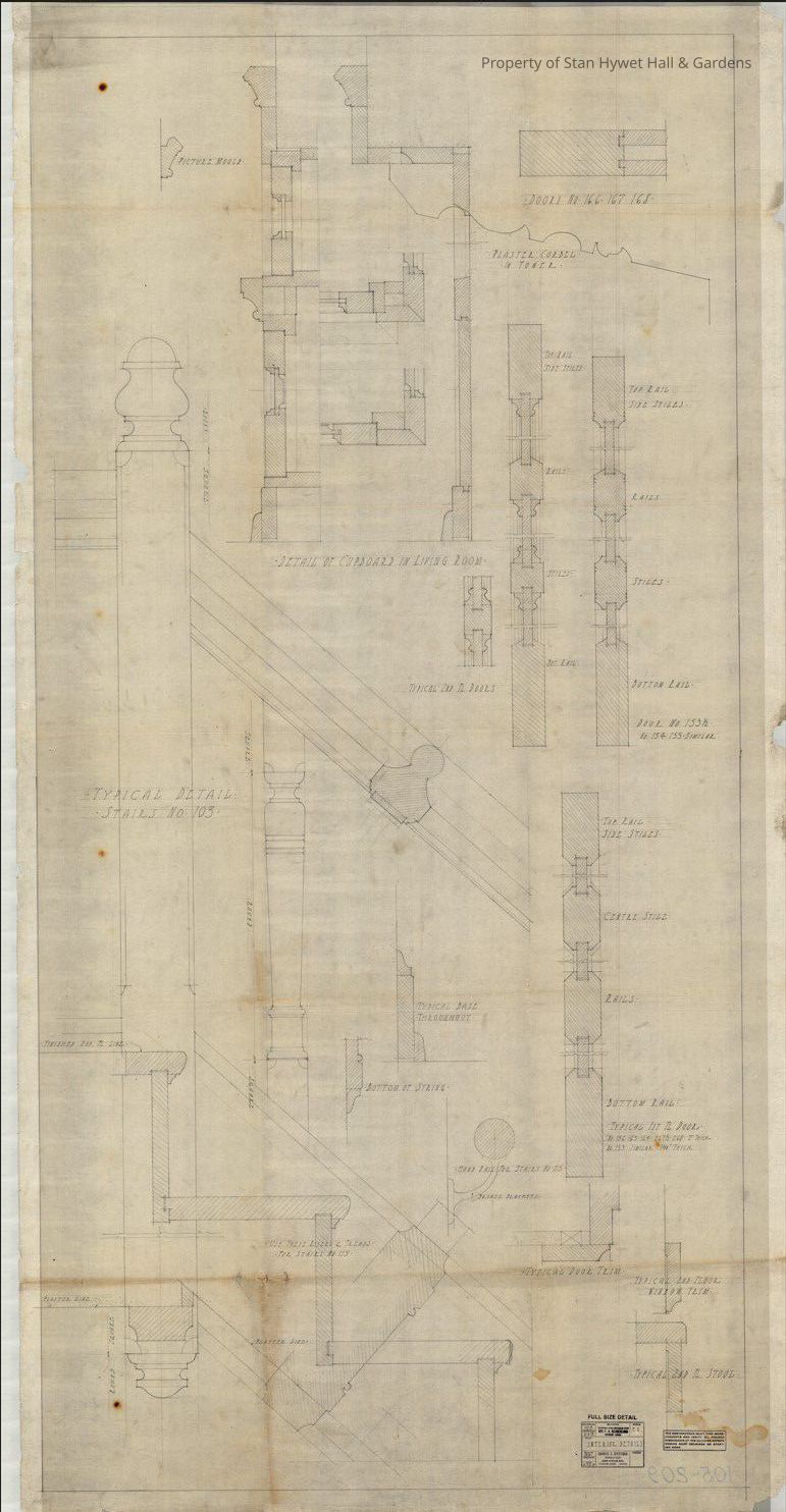 Historic drawing: Full sized interior details of different elements of Carriage House, like stair railings, cupboards, doors, etc. Titled "Garage and Stable for Mr. F.A. Seiberling: Interior Details".
