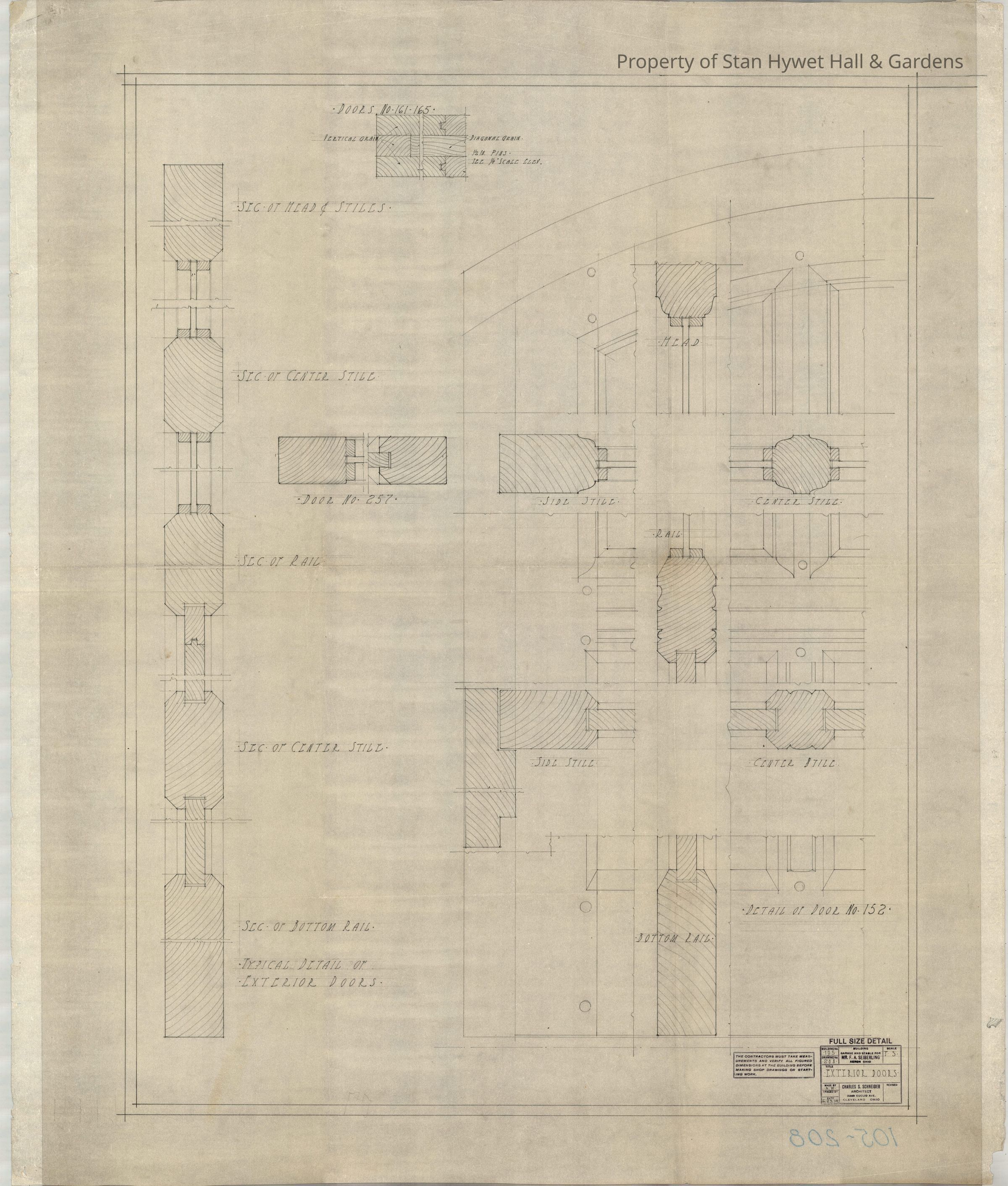 Historic drawing: Full size details of the exterior doors of the Carriage House. Titled "Garage and Stable for Mr. F.A. Seiberling: Exterior Doors".