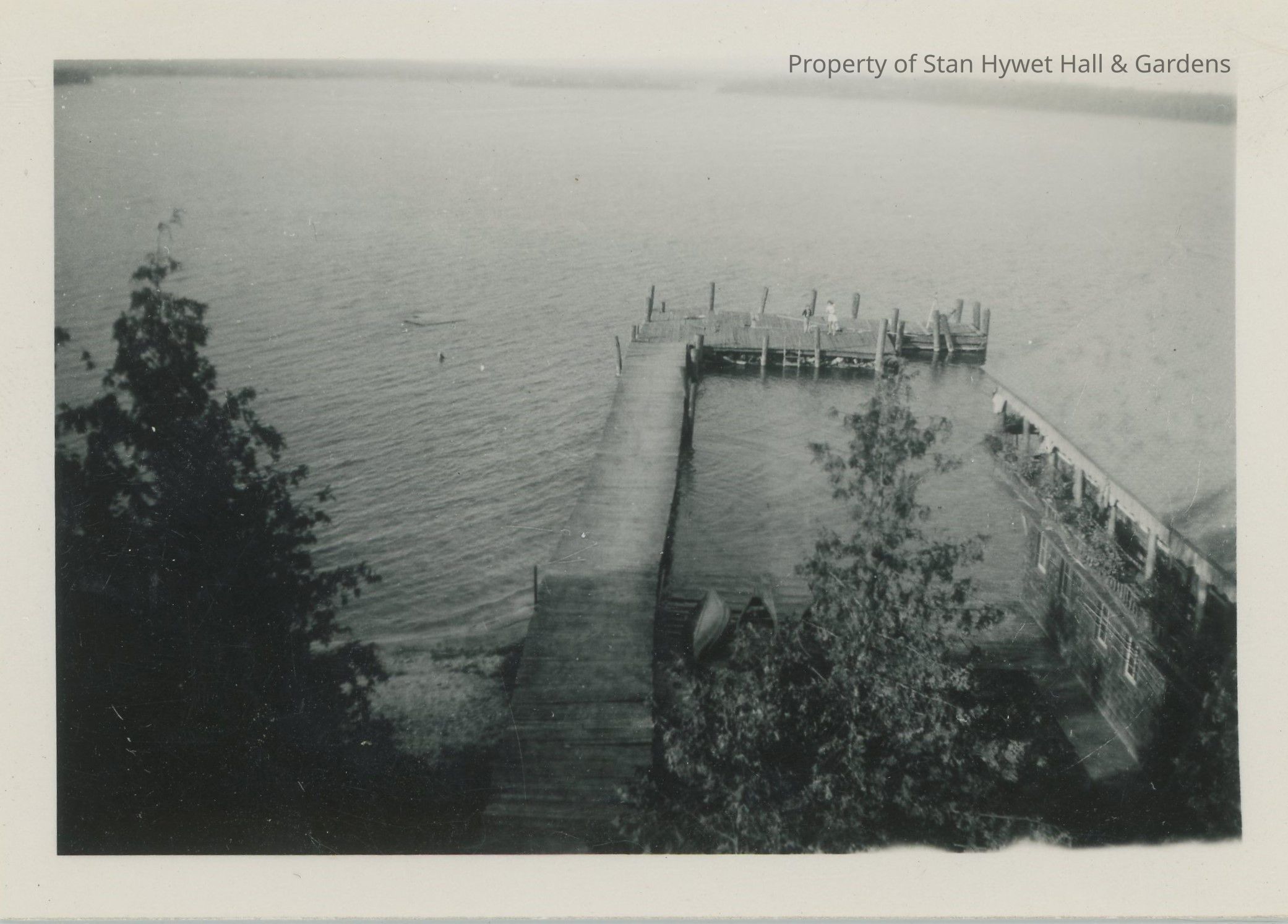 Black and white photographic print of the "L" dock as taken from the second story of the Main Cabin at Cedar Lodge. Side of boathouse at right edge of photo. Wooden dock goes out from shore and turns at right angle into wider docking area. Children are playing out there. Two canoes pulled up on shore between lodge and dock, one is bottom up, the other is upright. Pine trees tops in foreground, across water land almost at horizon line. Stamped on the back in black ink "490". Light seepage at bottom right edge.Photograph Details
