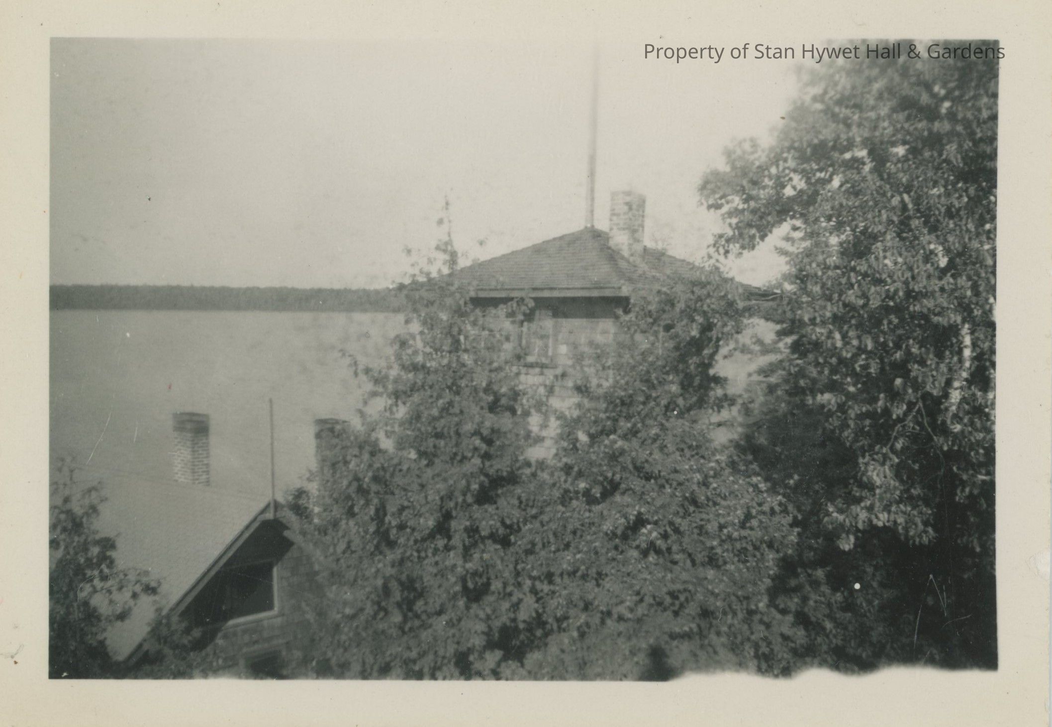 Black and white photographic print. Tower connected to boathouse at Cedar Lodge. Flag pole and chimney on tower roof are just right of center. The boathouse roof is left of the tower. Trees in foreground. Lake and shore at other side seen in distance across the water. Some light seepage at lower left edge. Printed on back, in black "490". Embossed lightly on the back "VELOX".Photograph Details