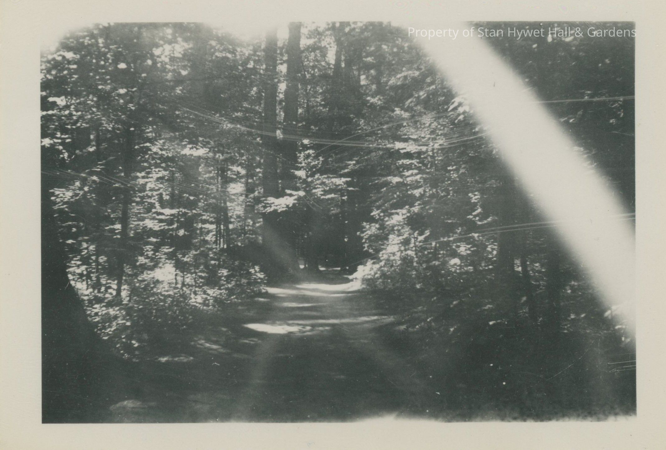 Black and white photographic print. Wooded area with a wide path down the center. Looks like wires crossing path above head height. Several areas of light seepage. At top and bottom edges one large streak across upper right corner almost 3/8" wide.Photograph Details