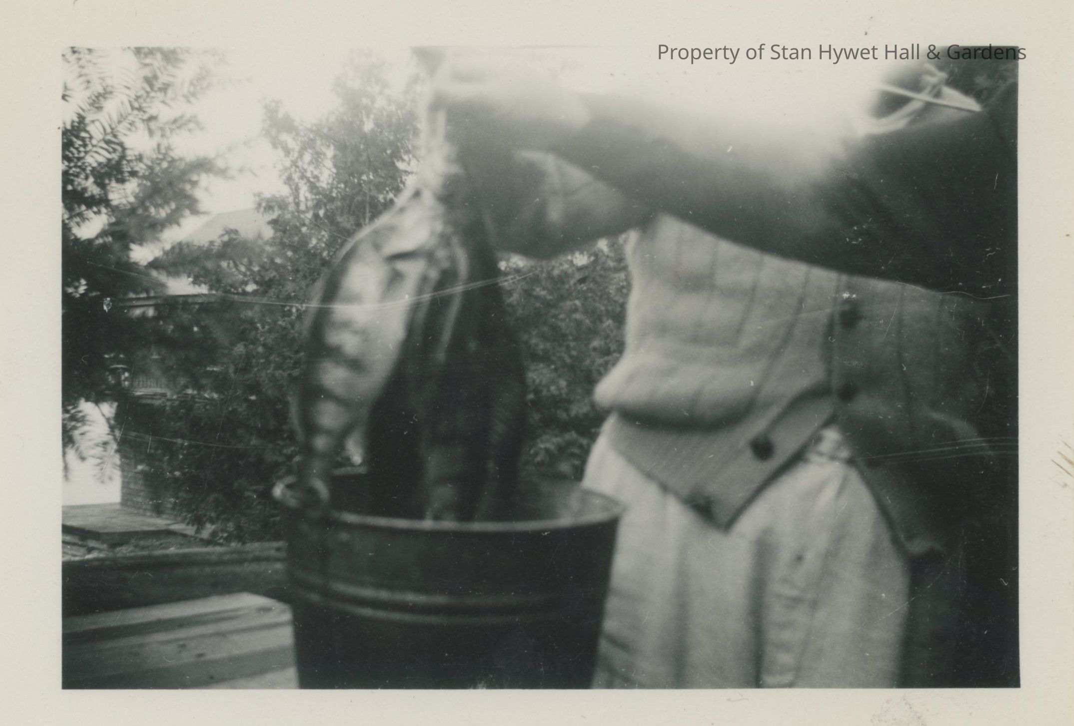 Black and white photographic print of a stringer of fish being held over a bucket. The fish are fairly large with stripes. Right arms of two people are holding up the strings of fish. Person in back has on a buttoned cardigan, last two buttons not fastened with light colored bottoms. Bucket is sitting on a wooden table outside with trees in background. Light seepage upper right edge.Photograph Details