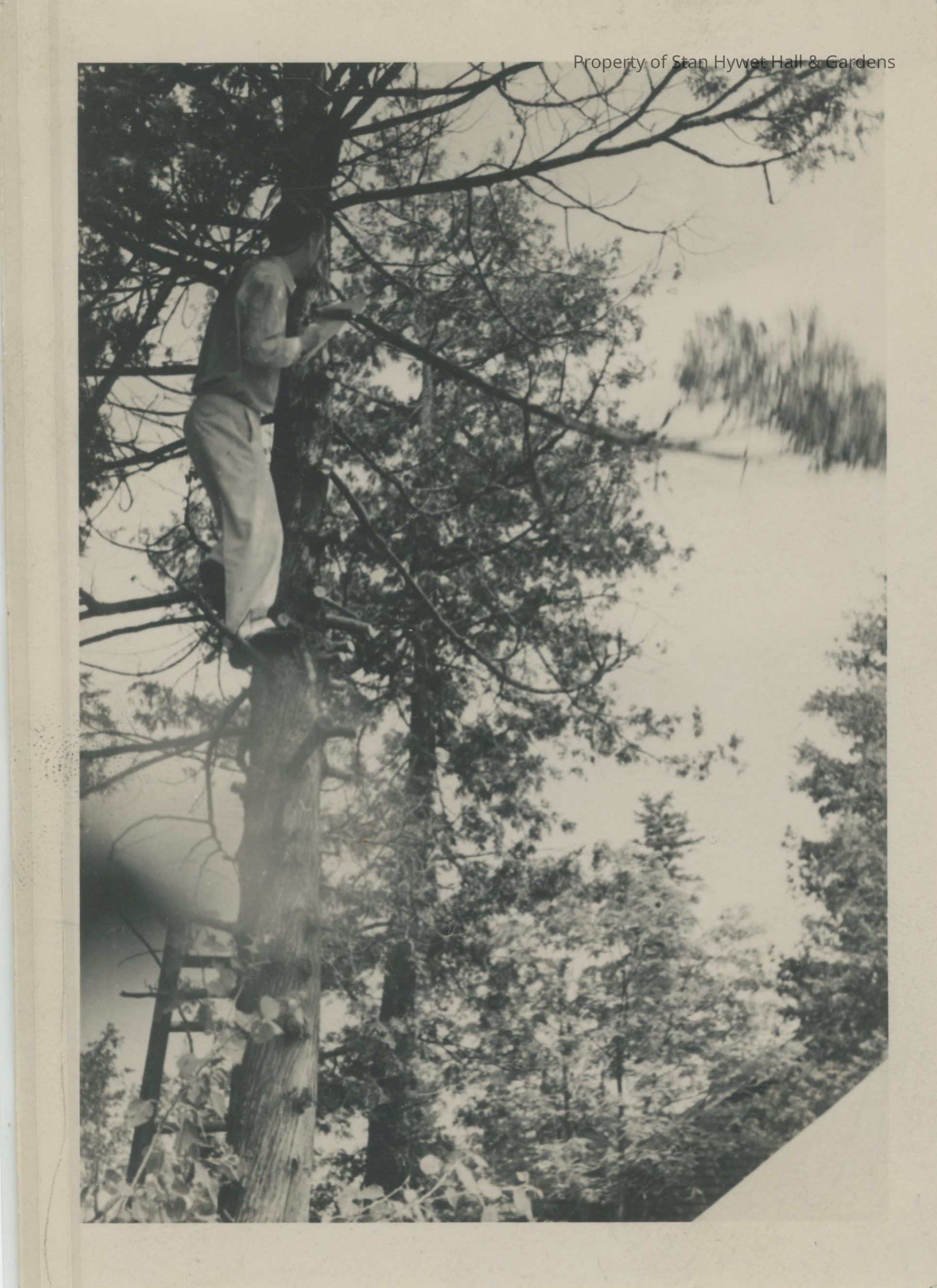 Black and white photographic print of a man standing high up in a pine tree on broken off limb. He appears to be recording something on a clipboard or possibly sketching something. He is wearing white shoes, light pants, and a sweater. More pine trees in background. Light seepage or finger over lens at lower left edge. Corner of negative lower right is missing, no image developed.Photograph Details
