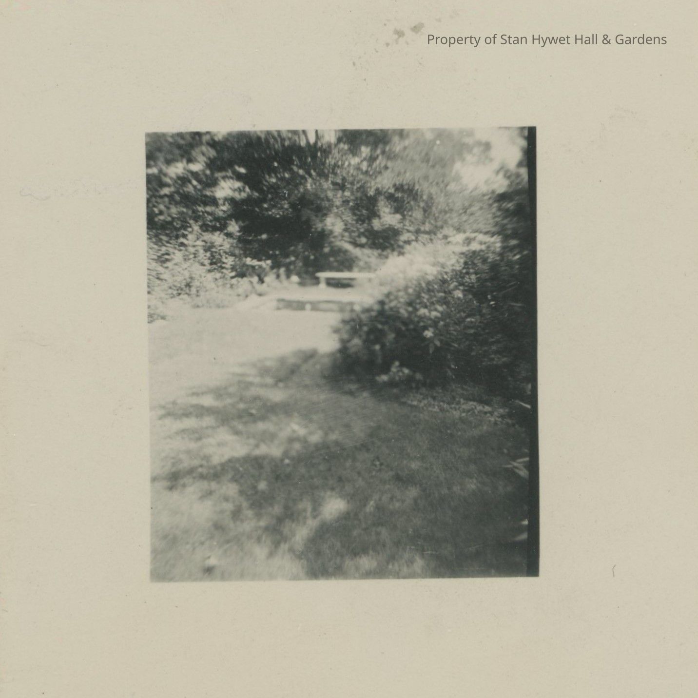 Black and white photographic print with 5/8" white border. Grassy area in bright sunlight with shrubs half in shade half in sun. Trees shadow most of bottom part of photo. Grass leads around from right curving left then going straight toward two benches.Photograph Details