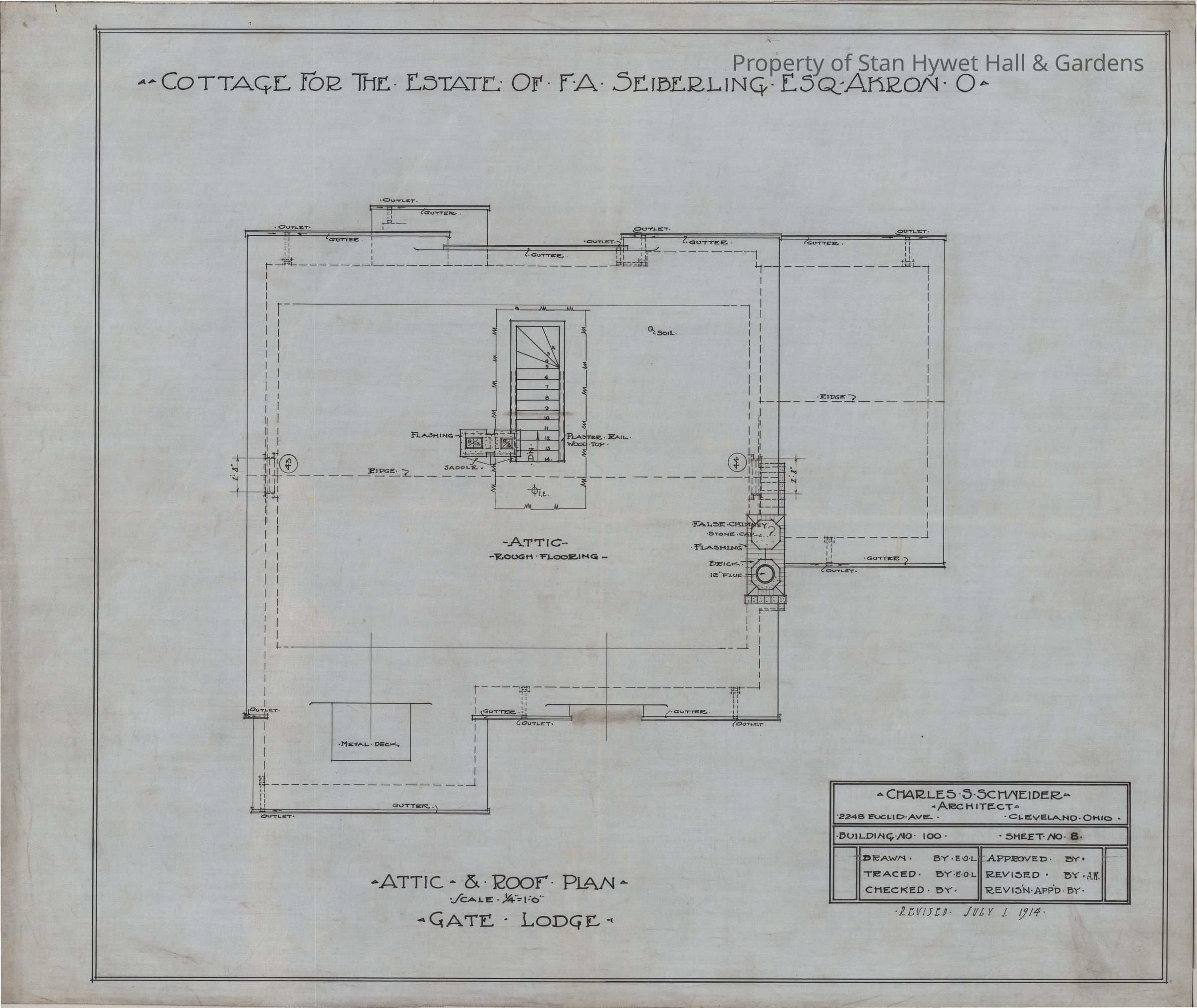 Historic Blueprint: Attic and roof plan for Gate Lodge. Titled "Cottage for the estate of F.A. Seiberling, ESQ, Akron O"