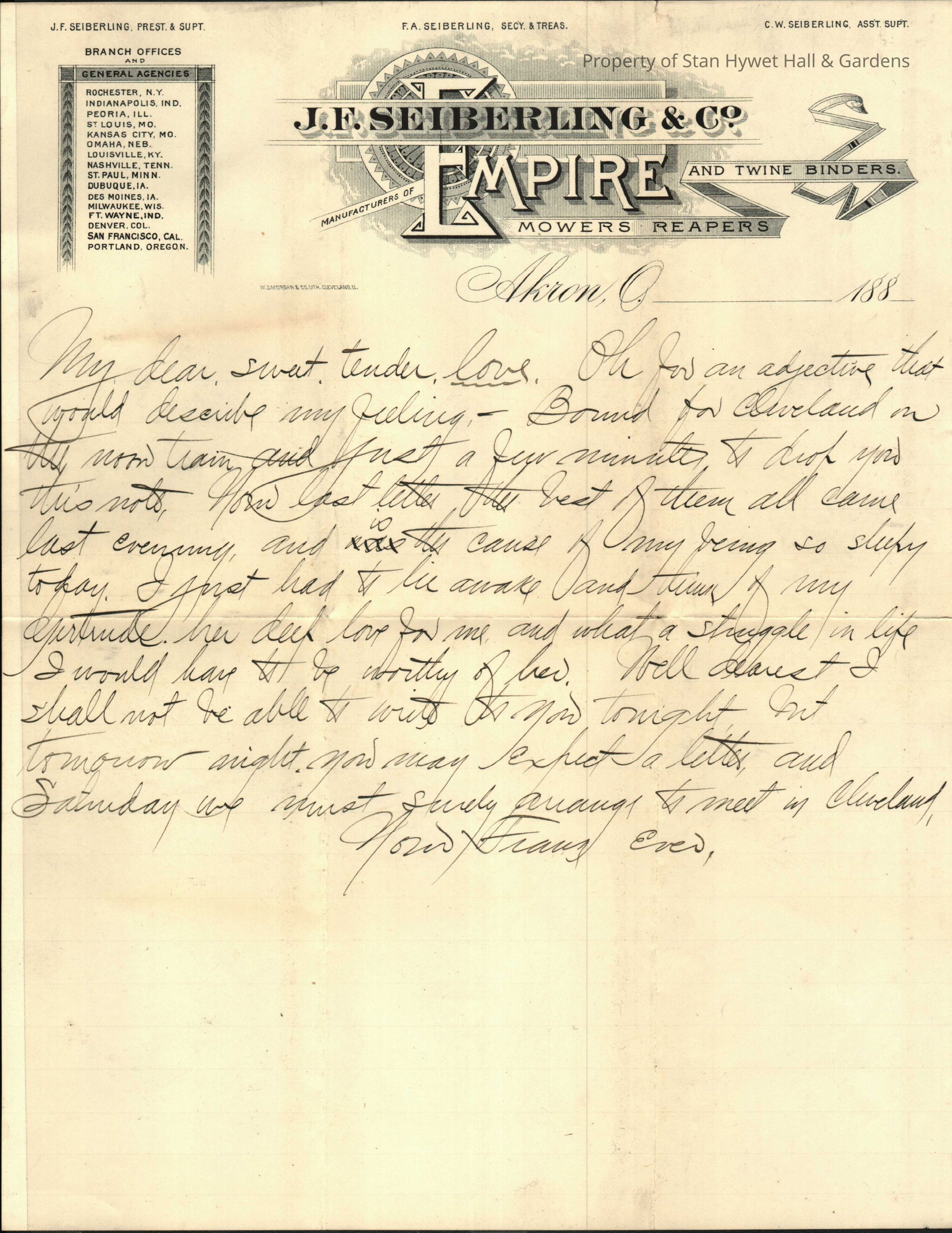 Handwritten letter on J.F. Seiberling & Co. Empire Mowers Reapers and Twine Binders letterhead, written by F.A. Seiberling to Gertrude Penfield.Collection