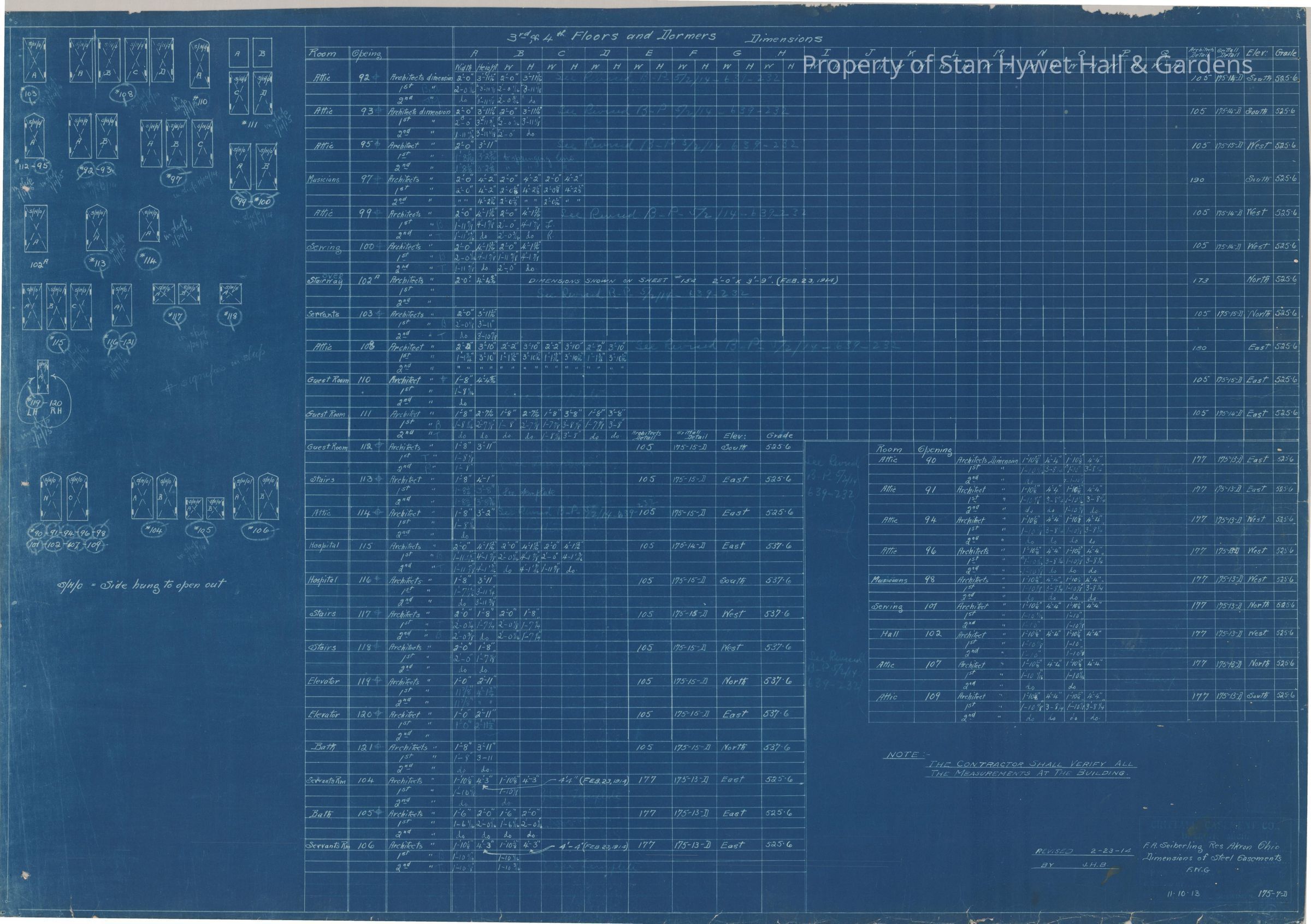 Historic Blueprint: Table detailing dimensions of steel casements for windows #90-121 in third and fourth floors (attic, guest rooms, servant areas). Titled "Dimensions of Steel Casements".