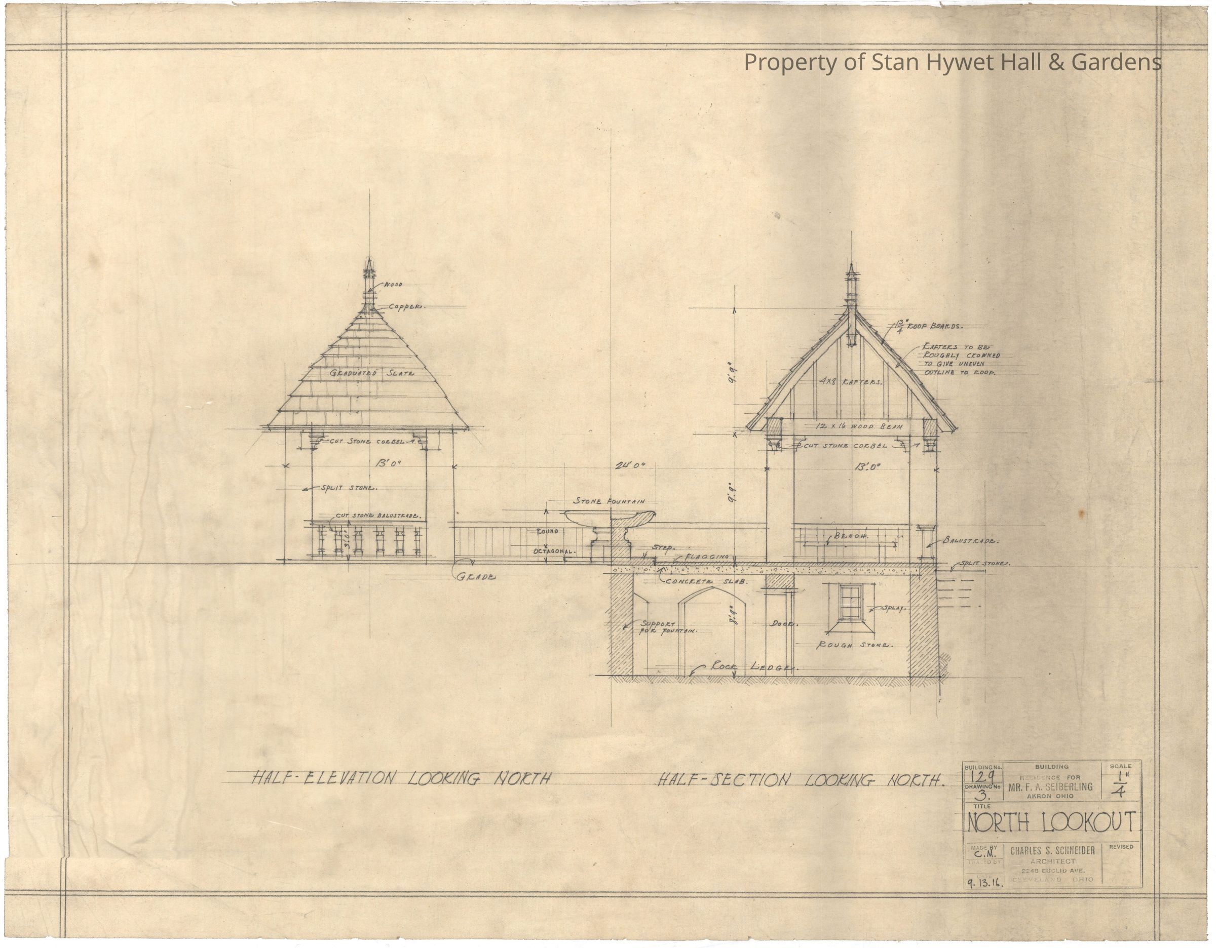 Historic drawing: Half elevation looking north (south elevation) & half section looking north of the Tea Houses. Titled "North Overlook".