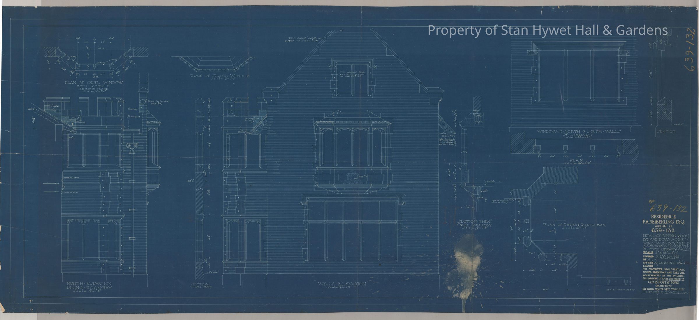 Historic blueprint: Detailed drawings of windows in the Dining Room, Blue Bedroom, and Library. Also includes plans of Dining Room bay windows. Titled "Detail of Dining Room Bay Window in Boy's RM-D & Windows in North & South Library Walls".
