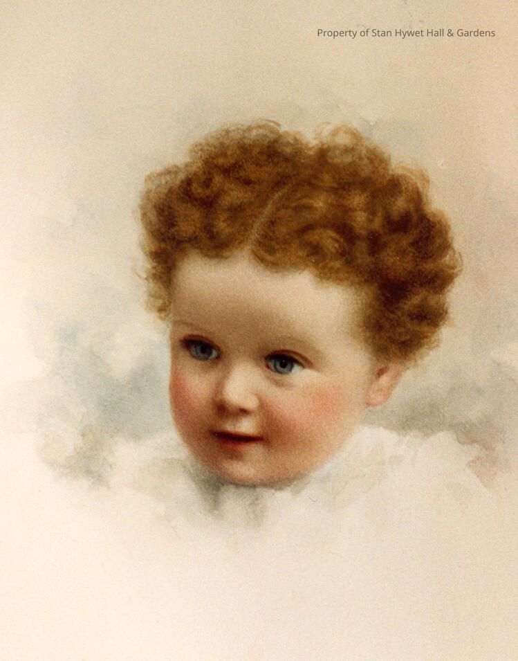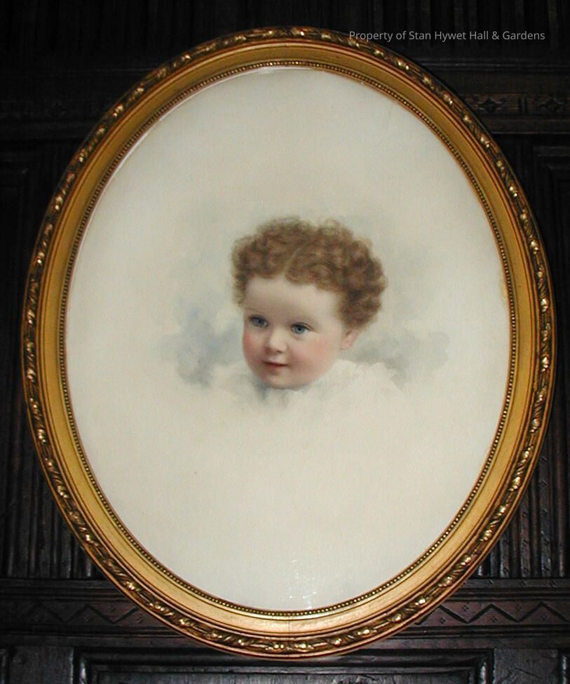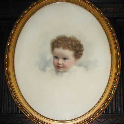 Framed, oval portrait under glass of infant Grace Wenonah Seiberling. Child's head and hint of collar of blouse/dress portrayed. Child's head turned to viewer's left, head tilted at downward angle. Hair is parted in center and is short, light brown, and curly. Child's left ear is visible under hair on viewer's right. Child's eyes are deep blue. She has round rosy cheeks, pale, thin light brown eyebrows, small slightly open mouth, pink lips, and a small round nose. Tilt of head creates shadows on face. Face primarily illuminated from viewer's right side, Wide ruffled-edged collar under chin is white with gray shadows, Mixture of blue and gray shading around child's head and shoulders in watercolor brushstrokes.Artwork Details