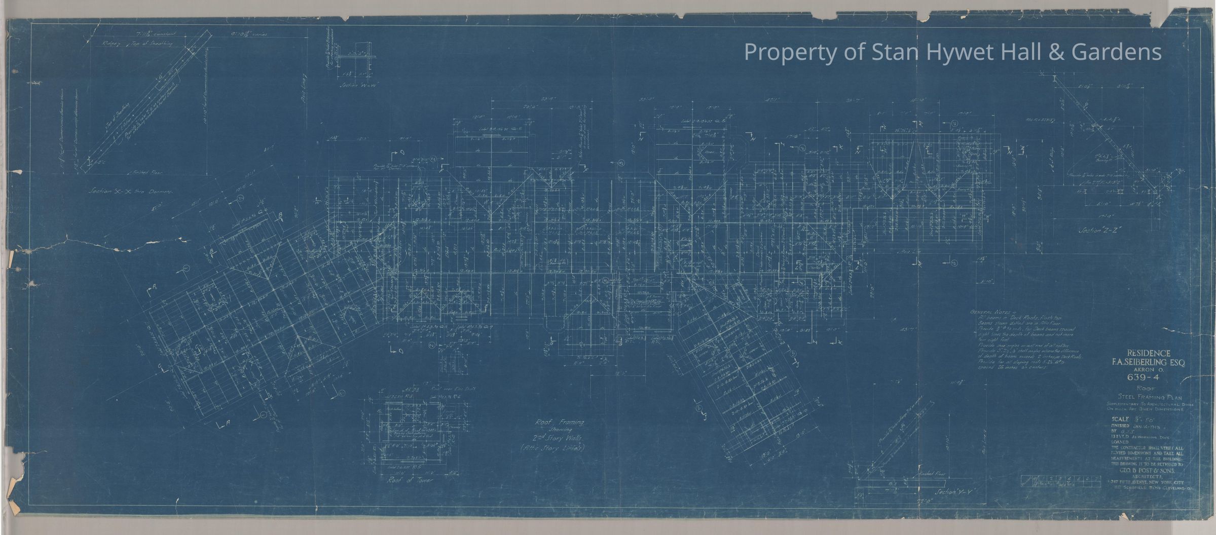 Historic blueprint: Steel frame plan for the roof of the Manor House. Titled "Roof Steel Framing Plan: Supplementary to Architectural dwg on which are given dimensions".