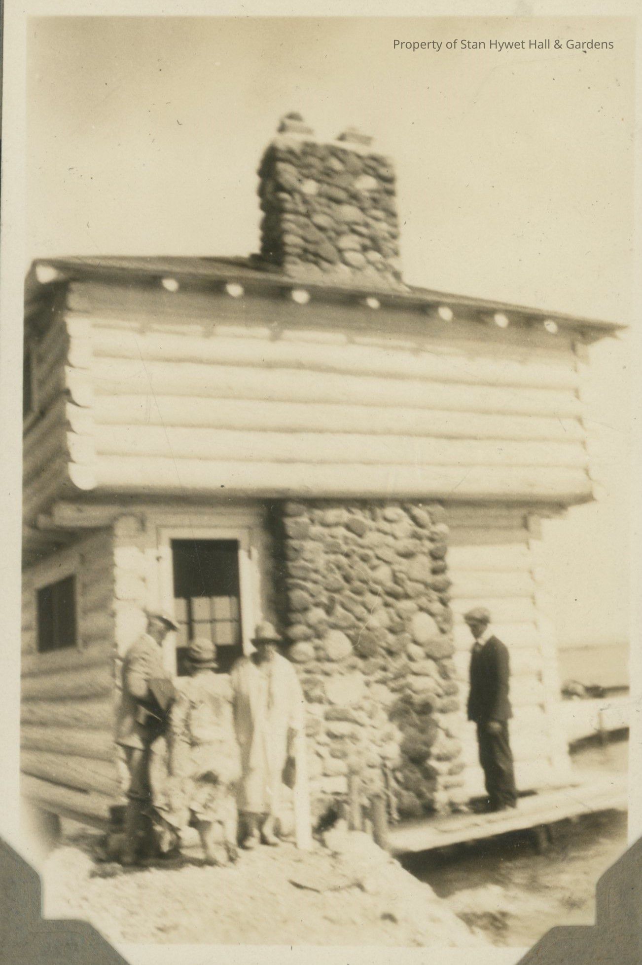 1 of 3 black and white photo print/snapshots attached by gray photo corners to a single black photo album page, all are slightly hazy. Print of four people standing in front of log building/cabin, the Block House at Cedar Lodge. Older man on left is in profile, facing Gertrude Seiberling, who is next with back to camera. Unidentified woman is standing to Mrs. Seiberling's proper right. Unidentified man in dark suit and cap to far right. Log building has stone chimney with raised walkway surrounding building.Photograph Details