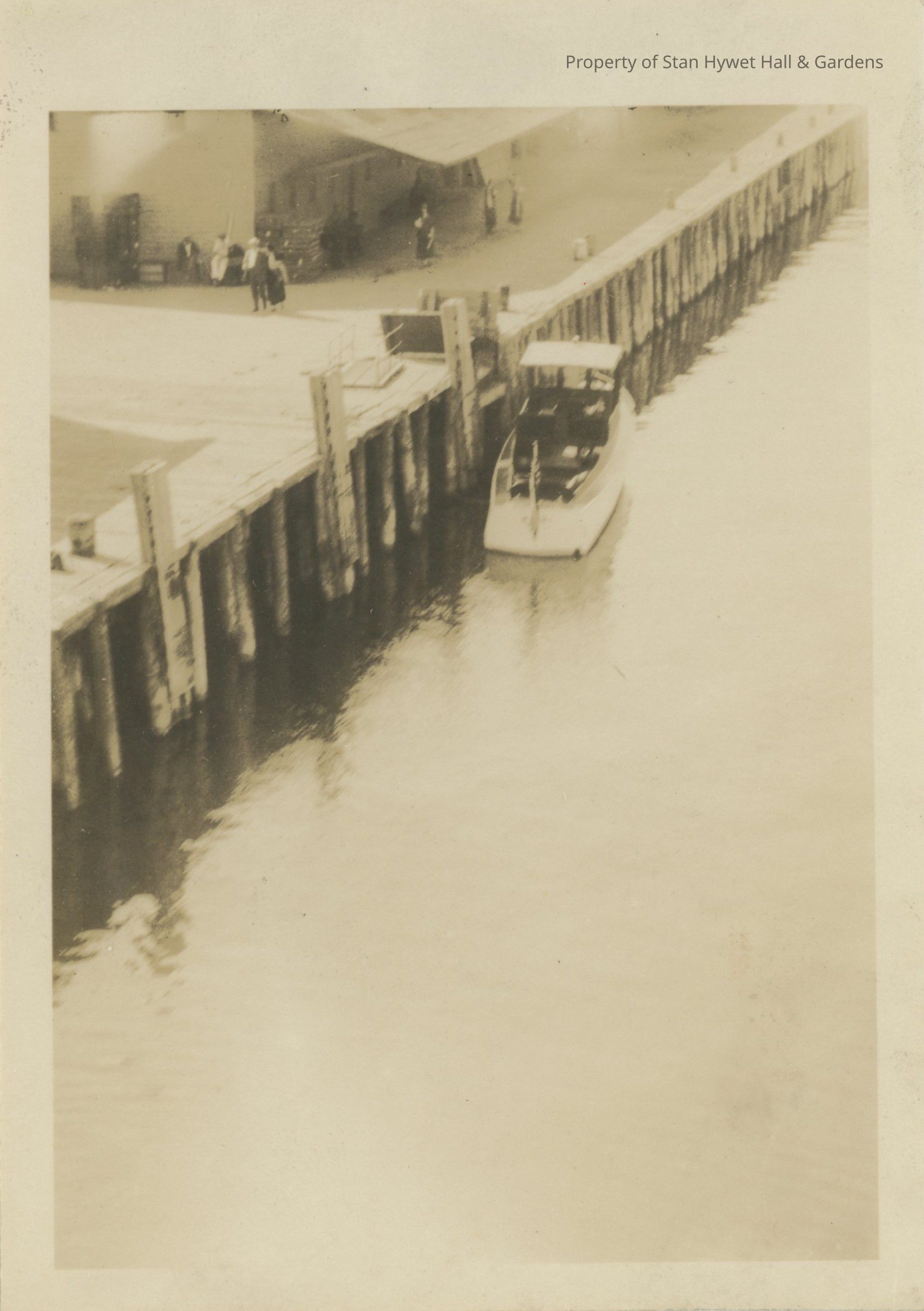 One of two Black and white photographs. Closeup view (taken slightly above ground) of dock area at Mackinac Island, Michigan Large empty white motor boat (possibly belonging to Seiberlings) docked on proper right side. Building and roof section partially visible on upper left corner of photo. Ten plus people around dock area and building. Water dominates the majority of the bottom and right side of photo. Dock area reflected on water surface. Stamped in black ink on back "59".Photograph Details