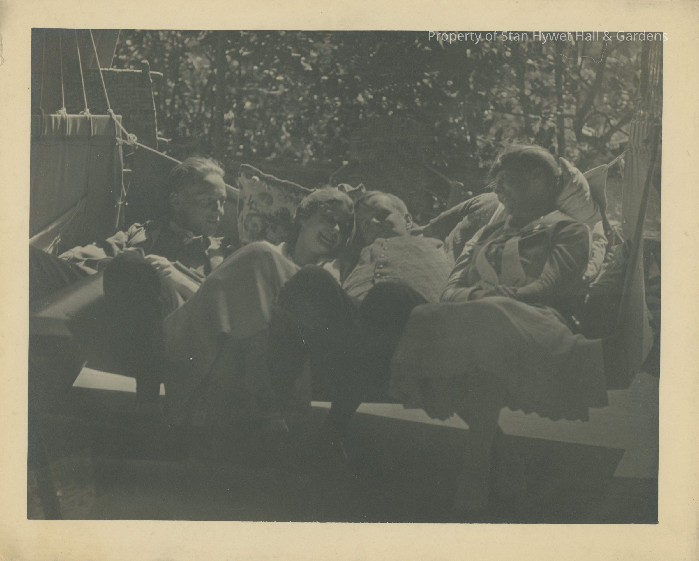 One of 2 black and white photo print/snapshot of four unidentified young adults (two men, two women) sitting on swinging hammock/couch on porch of cabin at Cedar Lodge, Michigan. Man on far left of photo has both hands on lap and head is turned to his proper left facing girl next to him. Woman second from left dressed in light colored dress has head resting on large pillow and head turned to her proper left. Woman has legs crossed. Man to her proper left (second from right) slumped in chair with head very close to woman on his right. Man dressed in dark slacks and light colored long sleeved shirt/coat with proper left arm bent behind head. Woman on far right of photo dressed in light colored dress with hands folded on lap; her head turned to her proper right and feet crossed near floor; swinging hammock/couch suspended by both left and right ends. Trees and shrubs in background.