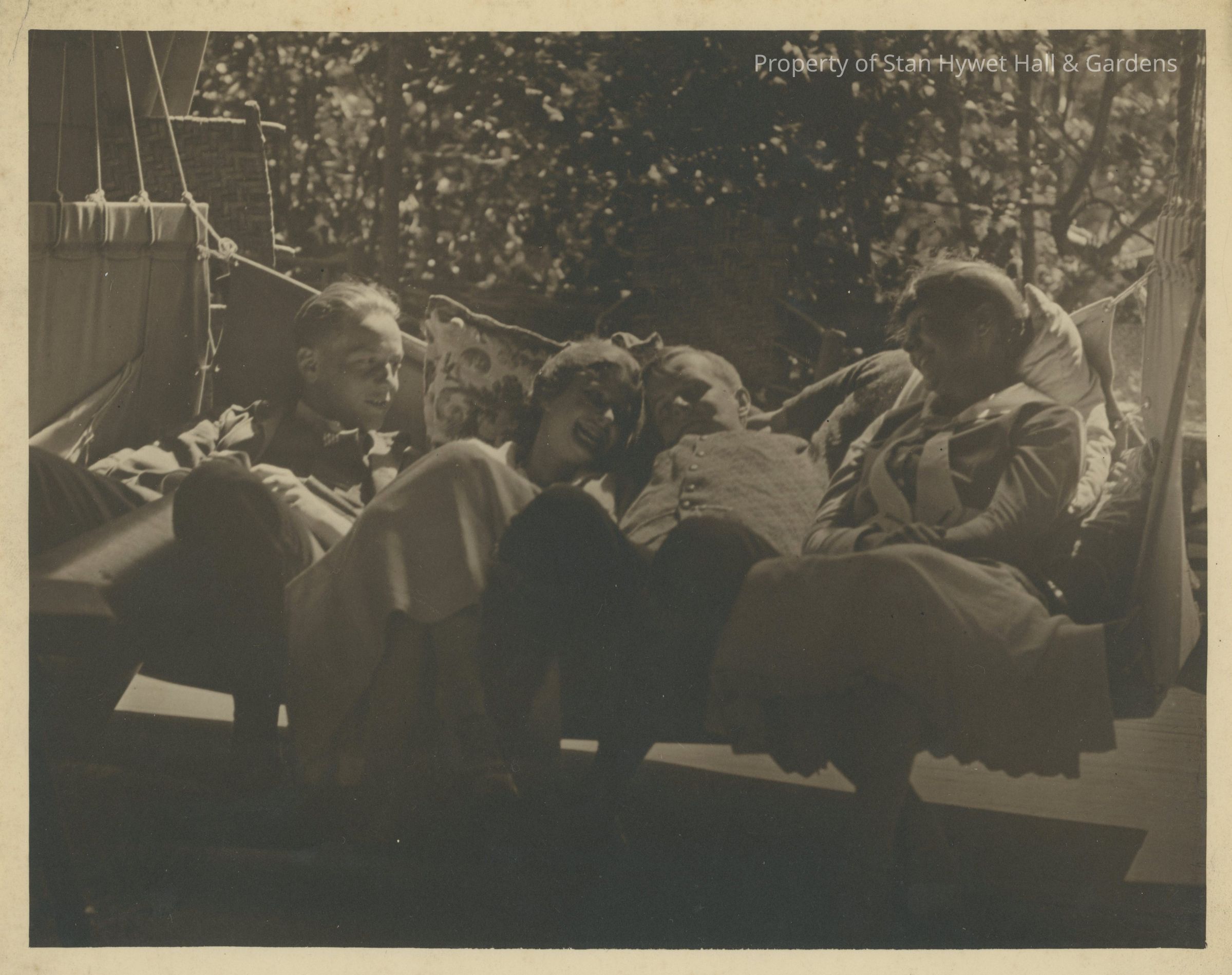 1 of 2 black and white photo print/snapshot of four unidentified young adults (two men, two women) sitting on swinging hammock/couch on porch of cabin at Cedar Lodge, Michigan. Man on far left of photo has both hands on lap and head is turned to his proper left facing girl next to him. Woman second from left dressed in light colored dress has head resting on large pillow and head turned to her proper left. Woman has legs crossed. Man to her proper left (second from right) slumped in chair with head very close to woman on his right. Man dressed in dark slacks and light colored long sleeved shirt/coat with proper left arm bent behind head. Woman on far right of photo dressed in light colored dress with hands folded on lap; her head turned to her proper right and feet crossed near floor; swinging hammock/couch suspended by both left and right ends. Trees and shrubs in background.