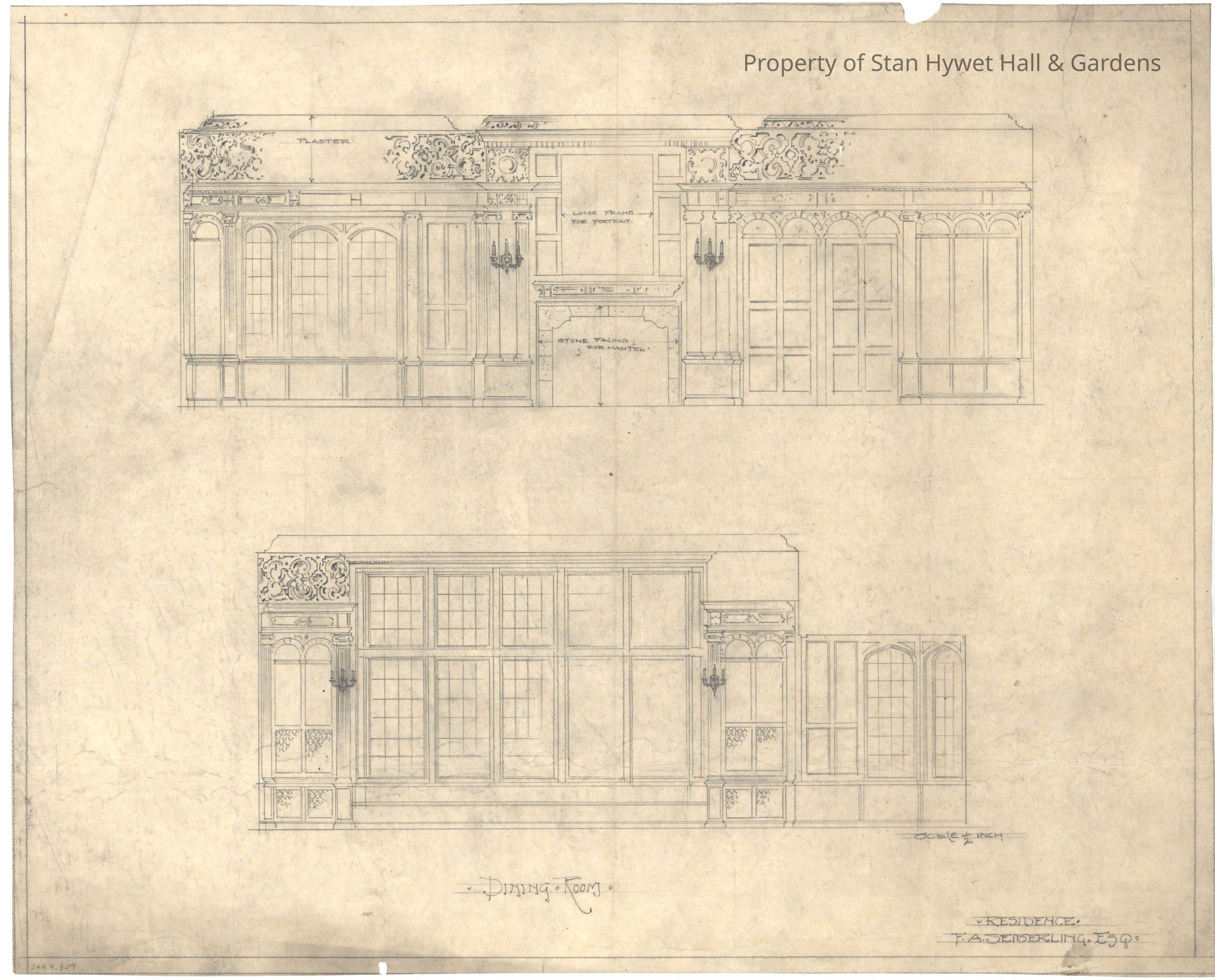 Historic drawing: Detailed concept drawing of the Dining Room's north and west walls. The fireplace over-mantel and the frieze are different from the final design.