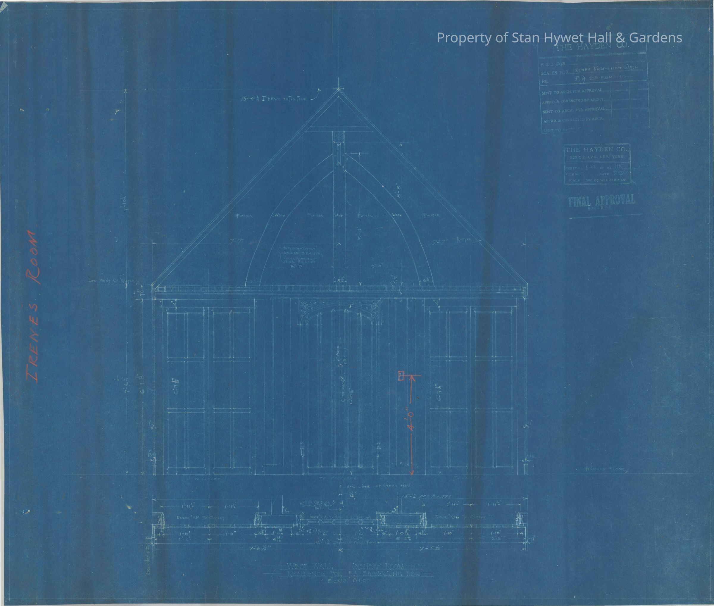 Historic blueprint: West elevation of Irene's Room in Stan Hywet Hall. Titled "West Wall Irene's Room".