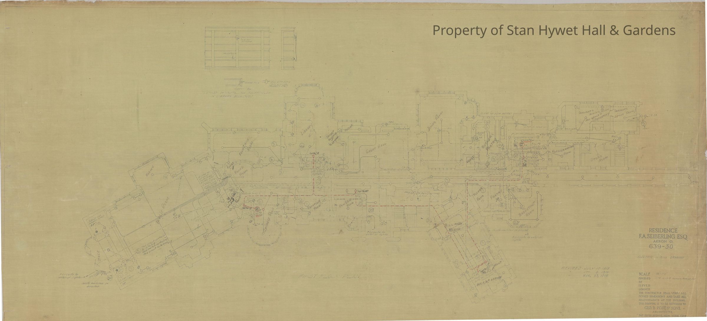 Historic Drawing: First floor plan [electric wiring] of Stan Hywet Hall. Titled "Electric Wiring Drawing".