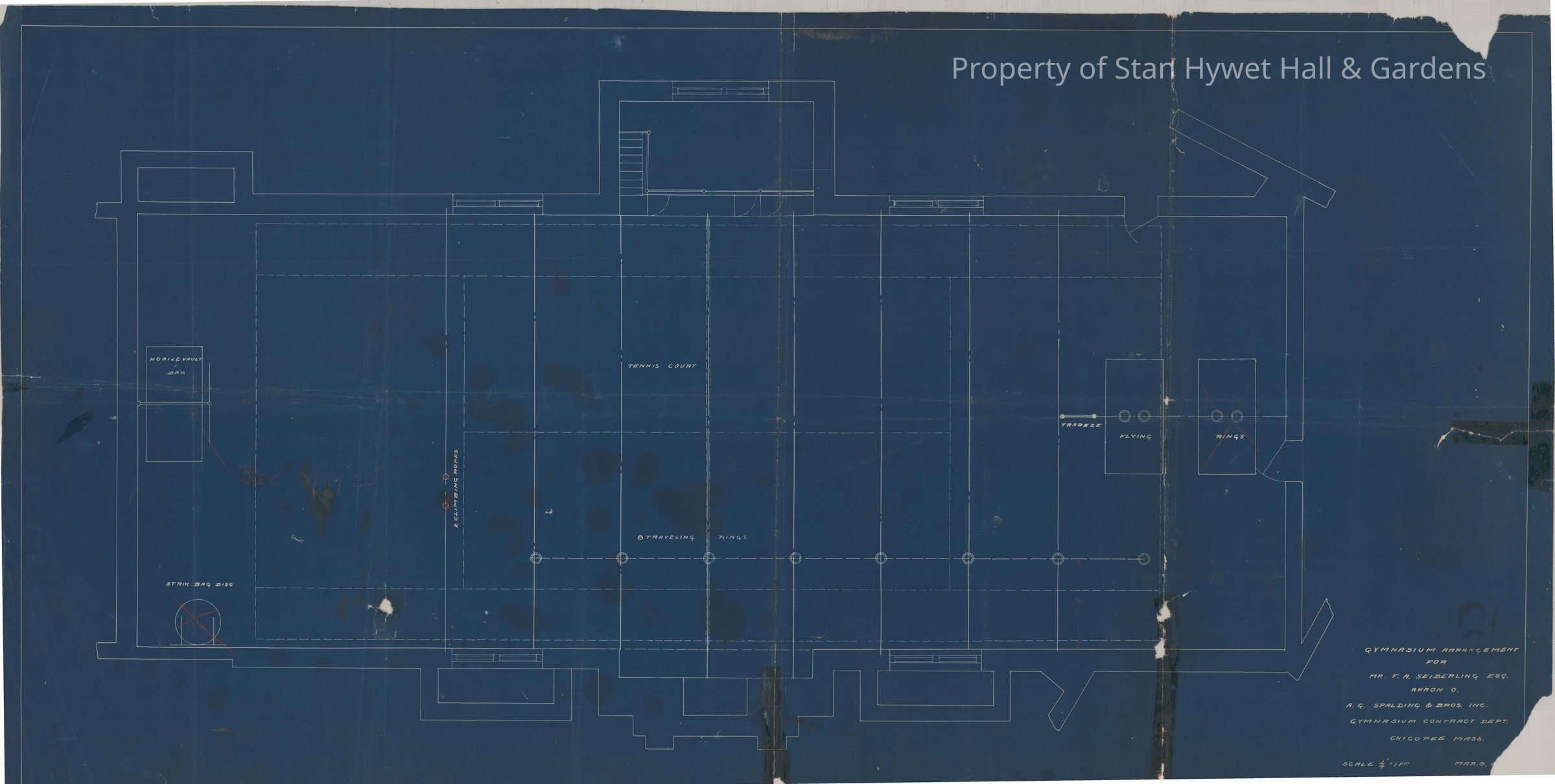 Historic Blueprint: Plan of Gymnasium arrangement for Stan Hywet Hall. Titled "Gymnasium arrangement for Mr. F.A. Seiberling, esq."