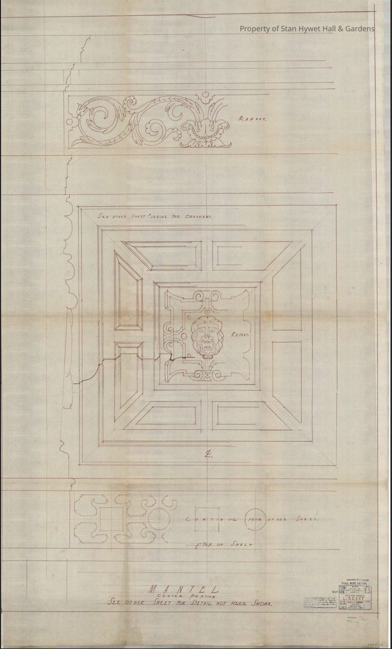 Historic drawing: Full sized woodwork details of the mantel in the Library. Titled "Interior Details Library: Mantel Center Portion".
