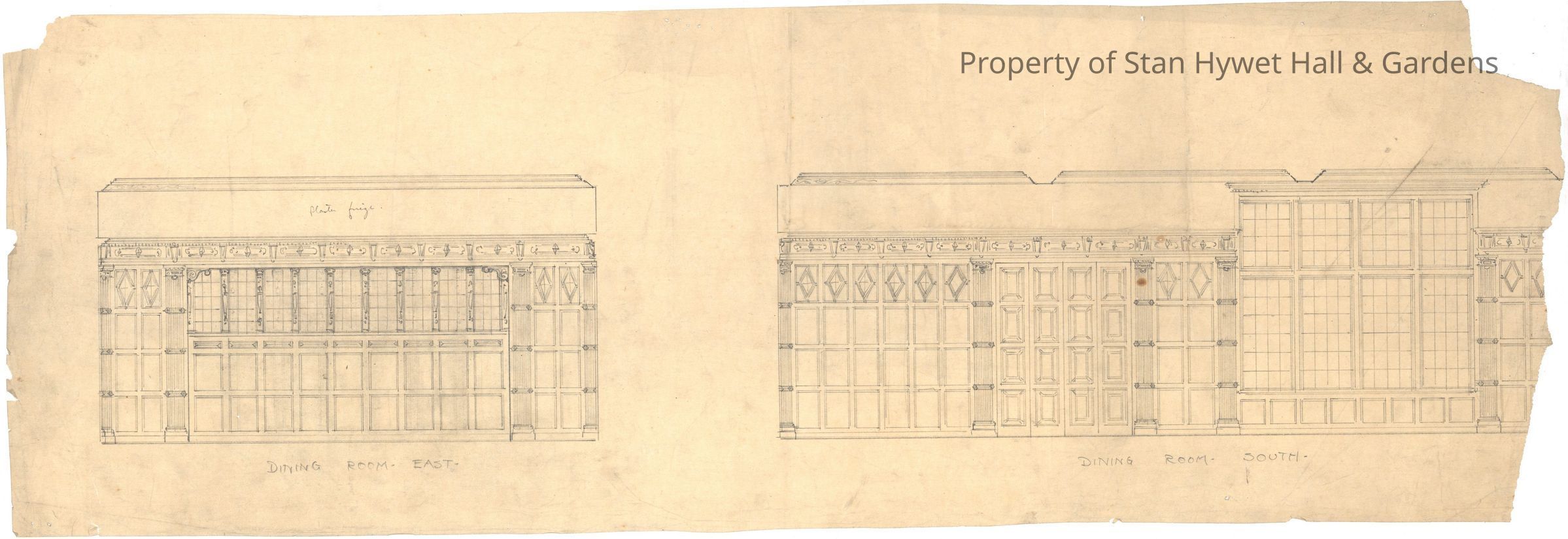 Historic drawing: Detailed concept drawing of the Dining Room's east and south walls. The drawing does not have a detailed depiction of the frieze. The wall paneling is different from the final design.Collection