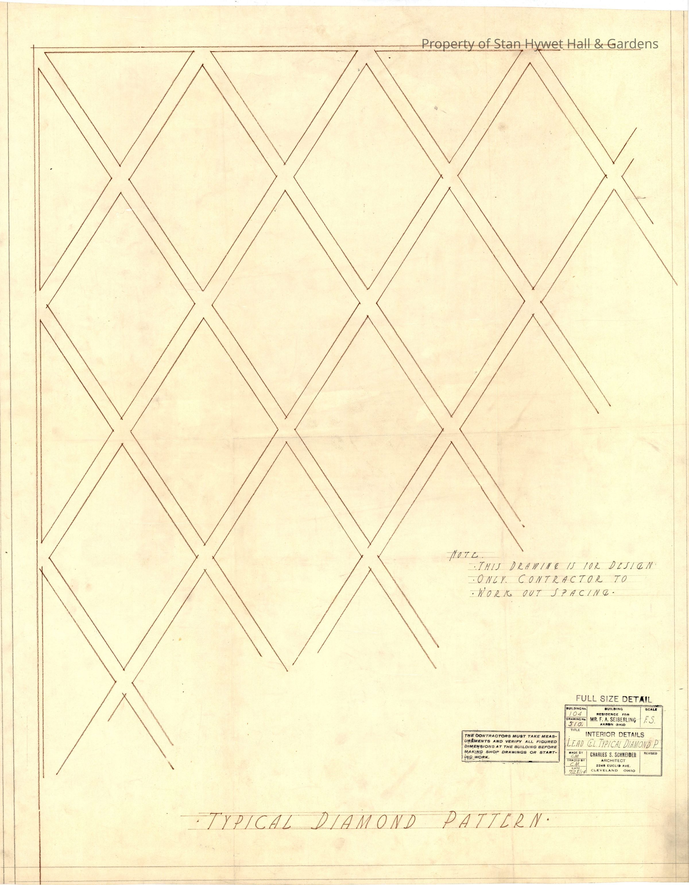Historic Drawing: Full sized drawing of diamond patterned leaded glass windows in Stan Hywet Hall. Titled Interior Details Lead GL. Typical Diamond P."