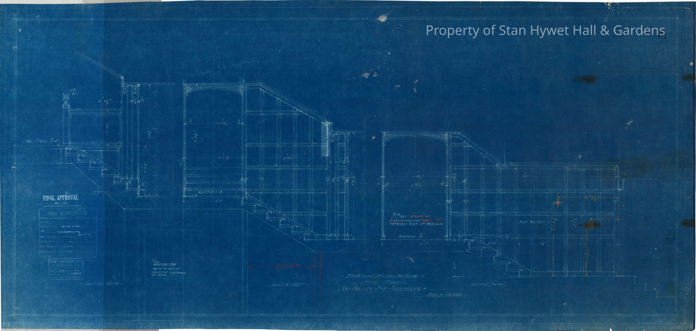 Historic blueprint: Elevations of Tower Stairs down to Plunge. Titled "Elevations of Wall Paneling, Stair Tower".