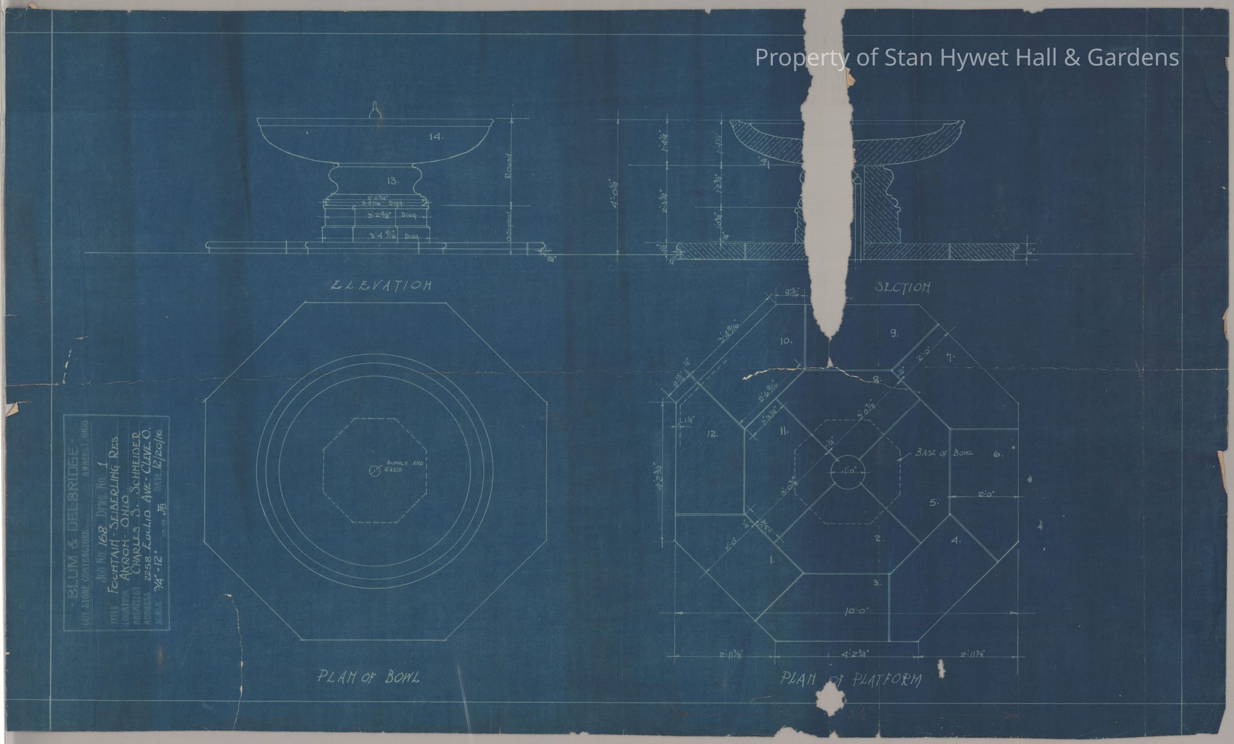 Historic Blueprint: Plans and elevations of the fountain at the Tea Houses (north overlook). Titled "Fountain--Seiberling Res."