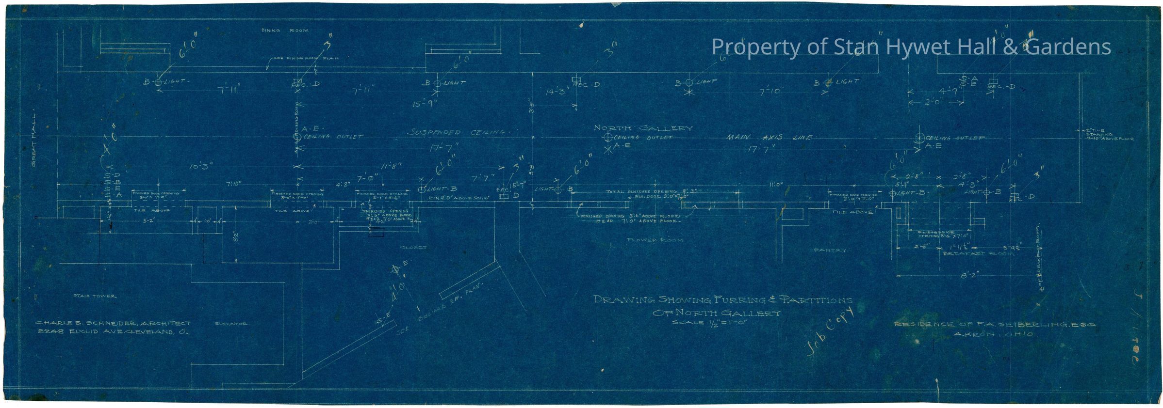 Historic blueprint: Plan for furring, partitions, and electrical for the North Hallway in Stan Hywet Hall. Titled "Drawing Showing Furring & Partitions of North Gallery".