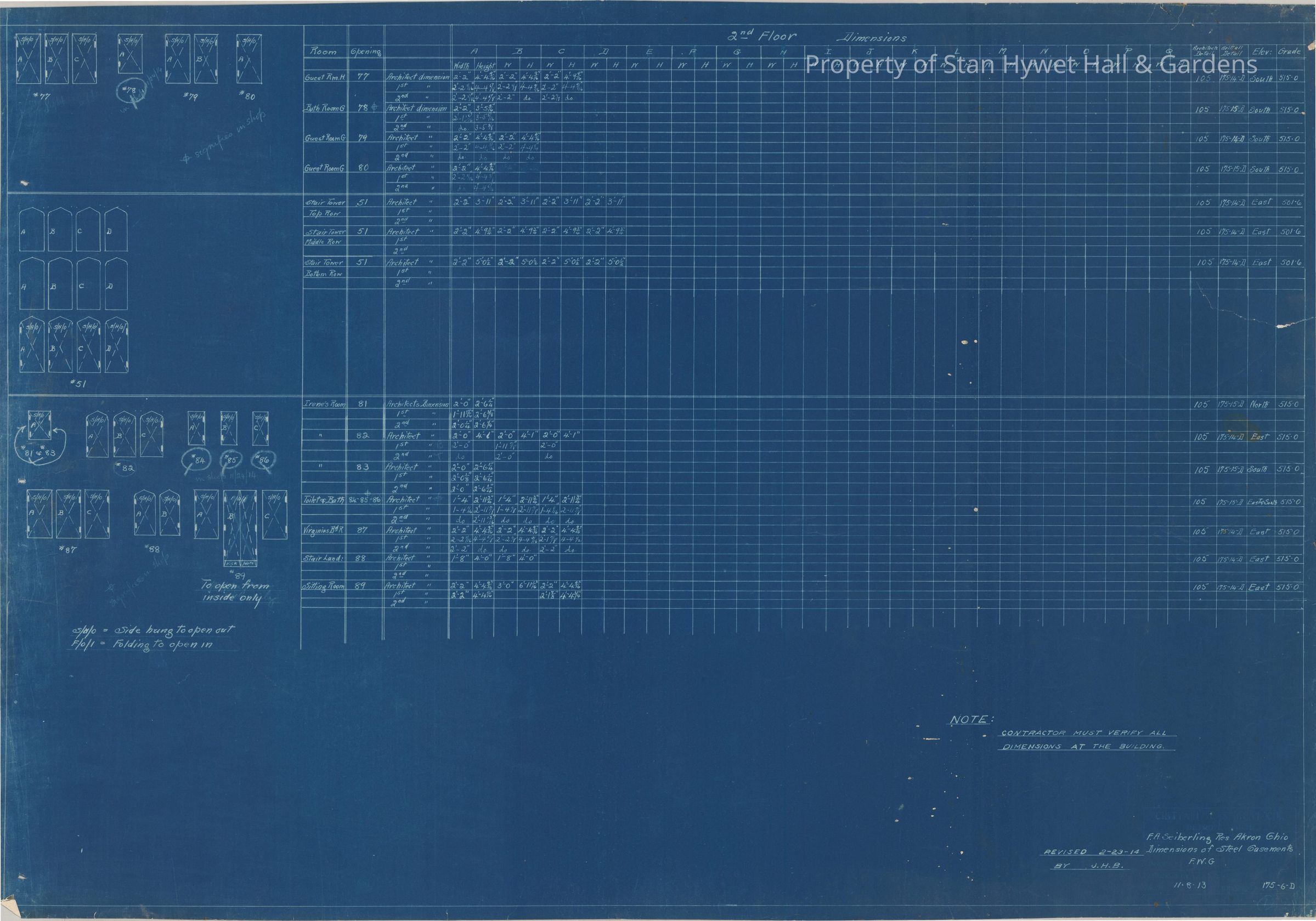 Historic Blueprint: Table detailing dimensions of steel casements for windows #51 & 77-89 on second floor (guest rooms, tower, Girls' Rooms, and Morning Room). Titled "Dimensions of Steel Casements".